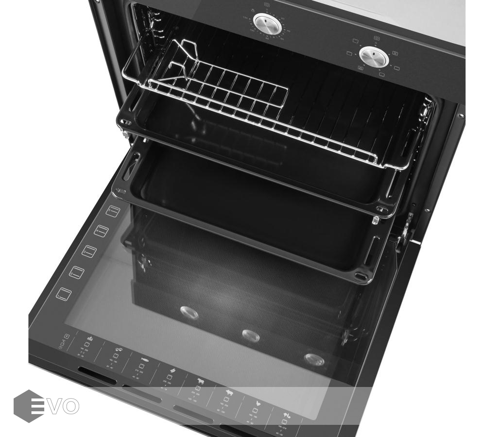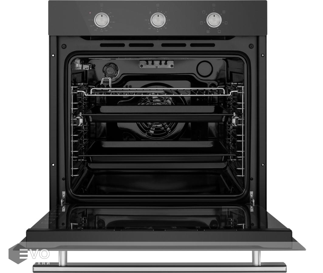 Фронтальная панель духовки и фасад ручки дверцы сделаны из высококачественного жаропрочного стекла черного цвета, окрашенного по всему объему, что является отличительной чертой бытового прибора премиум-класса. Механическое управление духовки осуществляется утапливаемыми поворотными ручками PUSH PULL, которые легким нажатием убираются внутрь корпуса. Можно выбрать режим работы, температуру готовки (50°-250°C) и устанавливать таймер (до 120 мин).