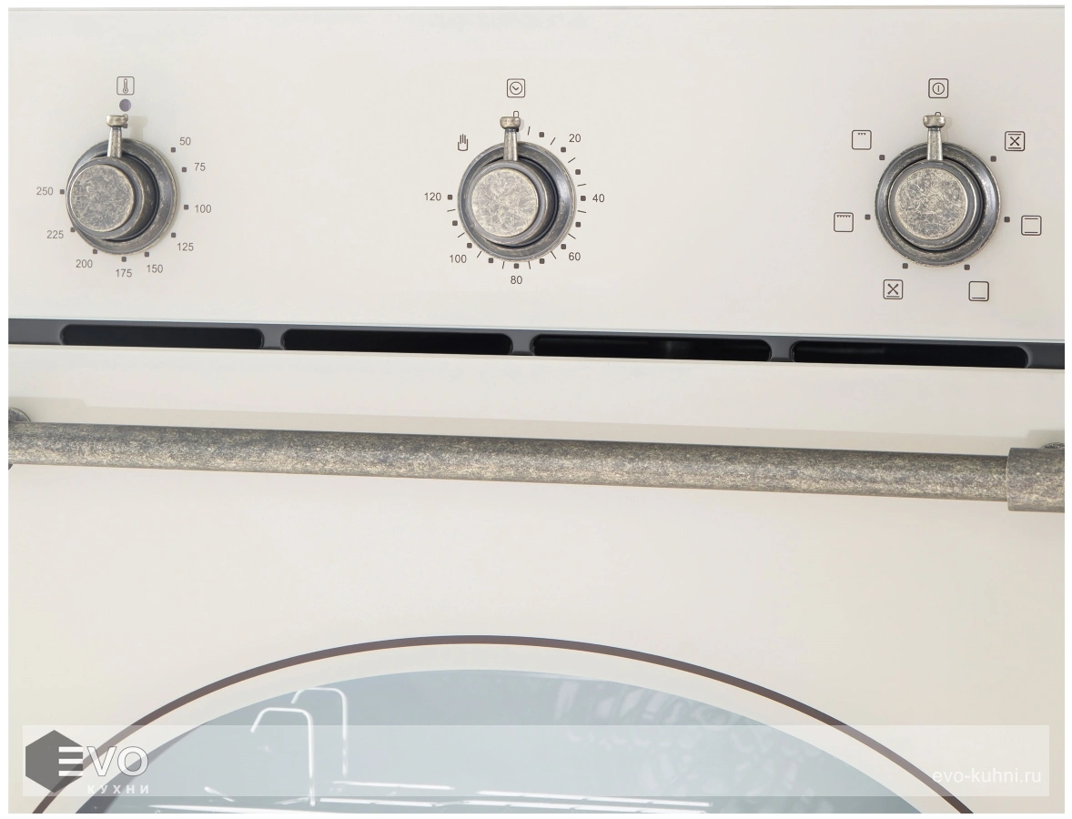 Фронтальная панель дверцы сделана из высококачественного тонированного жаропрочного стекла черного цвета. Цельнометаллическая фурнитура бронзового цвета, изготовленная в рустикальном стиле, идеально дополняет общий образ. Механическое управление с помощью поворотных ручек интуитивно понятно и позволяет выбрать режим работы, температуру готовки (50°-250°C) и включить таймер.
