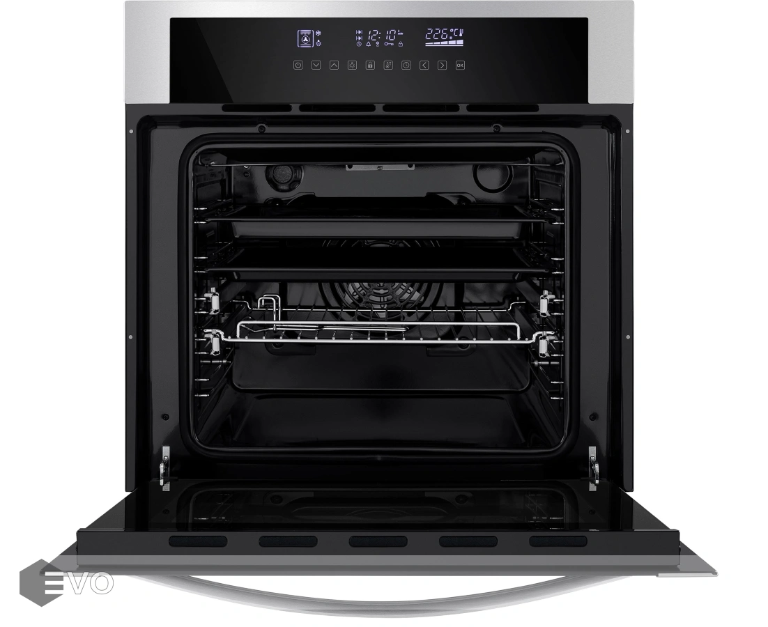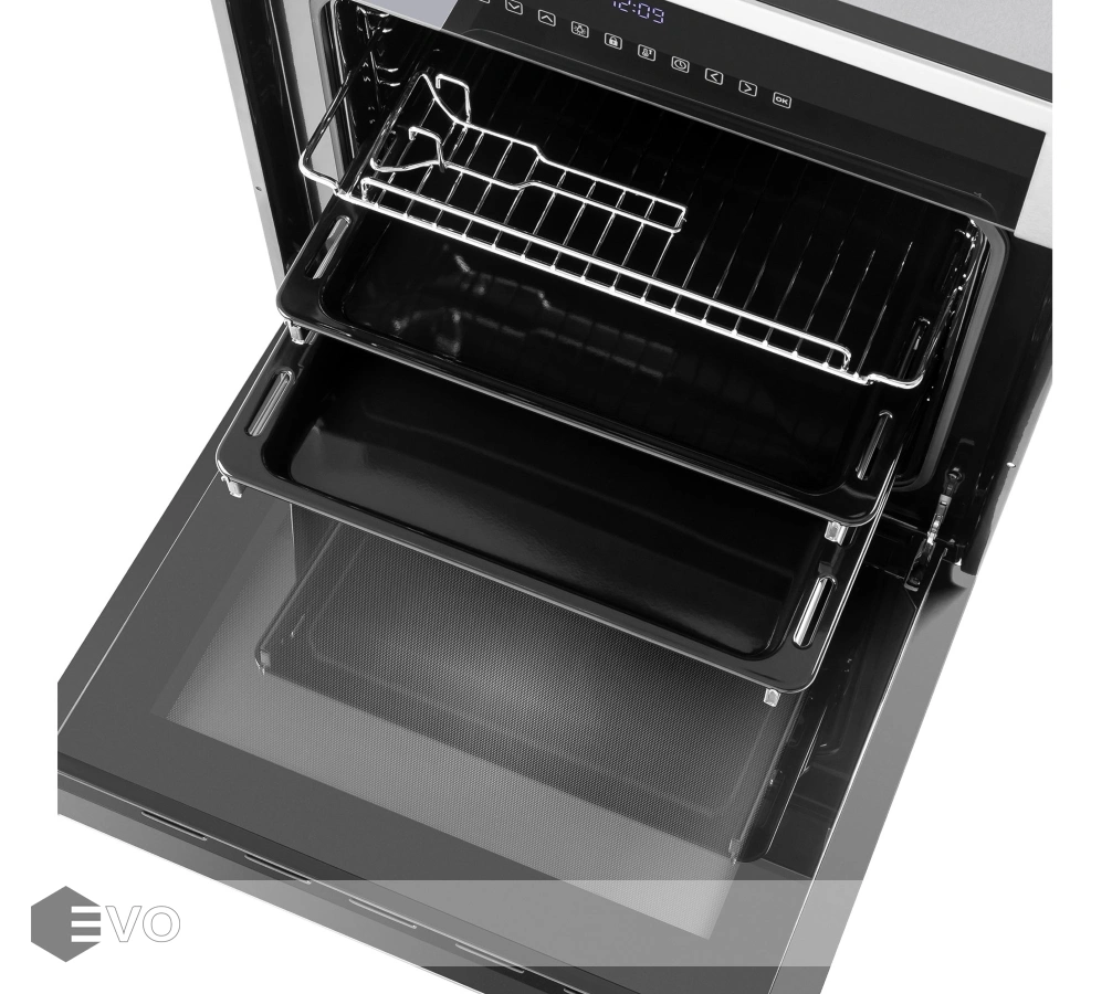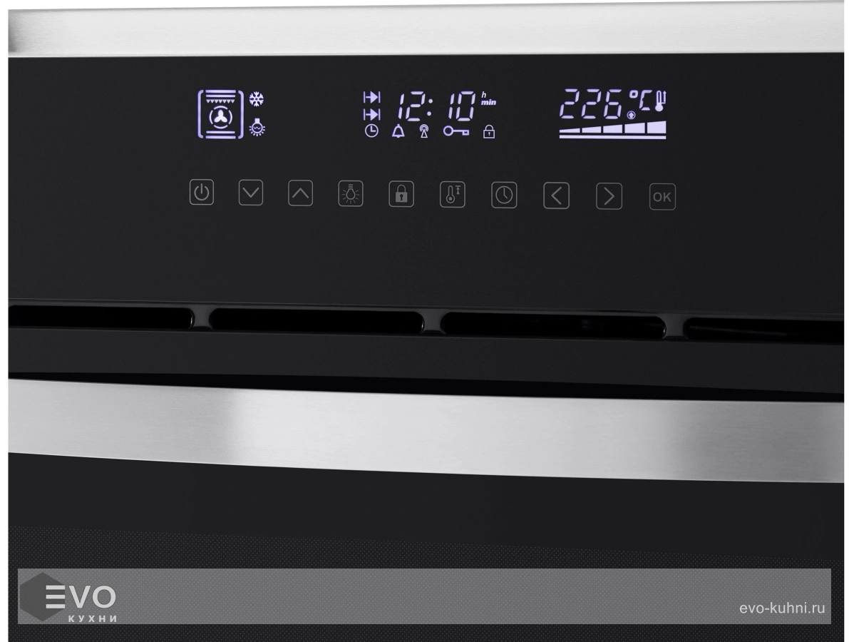 Фронтальная панель дверцы и лицевая часть блока управления сделаны из высококачественного жаропрочного стекла. Сенсорный программатор с дисплеем COLD WHITE интуитивно понятен и удобен в использовании. Позволяет выбирать режимы нагрева, температуру, длительность готовки, устанавливать таймер, блокировать панель управления и выводить код ошибки при появлении проблем в работе духового шкафа.