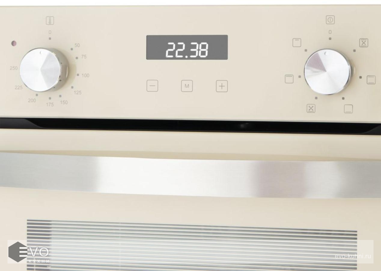 Фронтальная панель духовки сделана из высококачественного жаропрочного тонированного стекла черного цвета. Цельнометаллическая ручка дверцы остается холодной в процессе готовки. Комбинированное управление посредством сенсорного дисплея и цельнометаллических поворотных ручек позволяет установить таймер, выбрать температуру (50°-250°C) и один из 6-ти режимов работы.