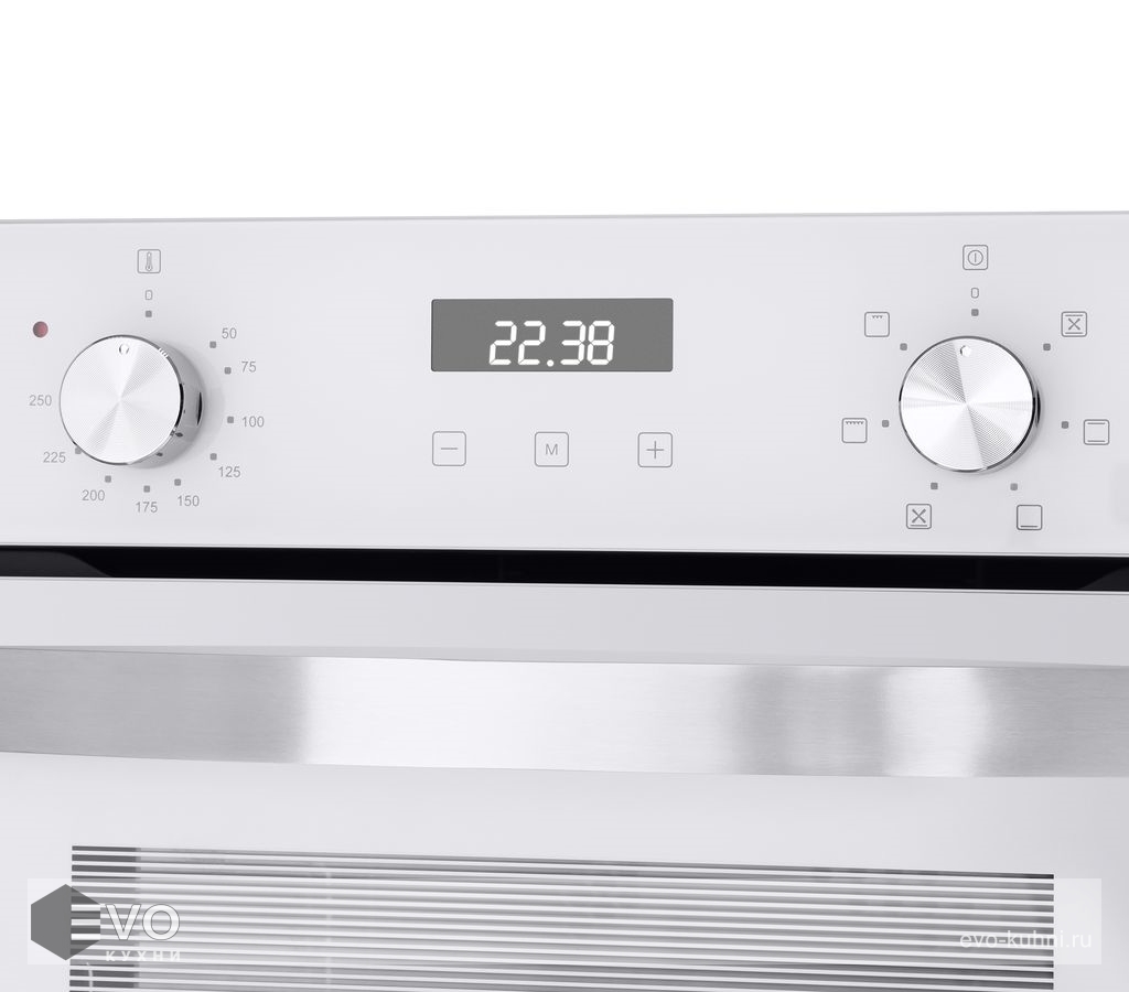 Фронтальная панель духовки сделана из высококачественного жаропрочного тонированного стекла черного цвета. Цельнометаллическая ручка дверцы остается холодной в процессе готовки. Комбинированное управление посредством сенсорного дисплея и цельнометаллических поворотных ручек позволяет установить таймер, выбрать температуру (50°-250°C) и один из 6-ти режимов работы.
