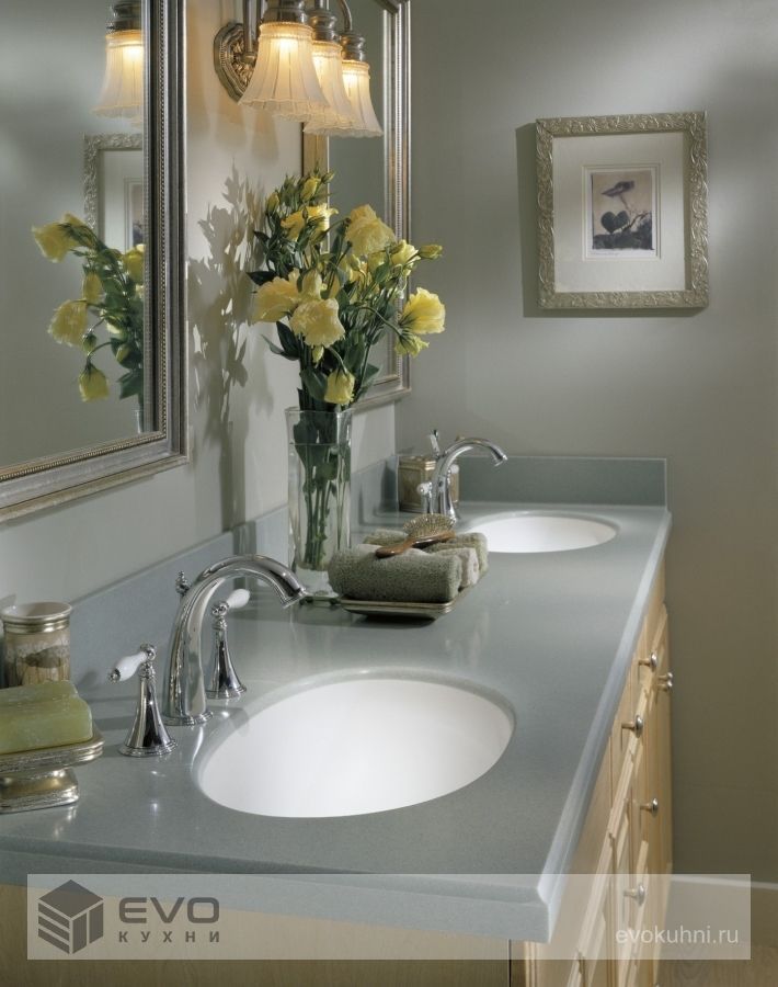 Дизайнеров этот материал привлекает тем, что при термообработке ему можно придать любую форму, поэтому из него зачастую производятся разнообразные элементы декора. Чаще всего, изделия из данного вида искусственного камня применяются в интерьерах ванных комнат, кухонь, для изготовления мебели, осветительных приборов, подоконников, при облицовке стен.