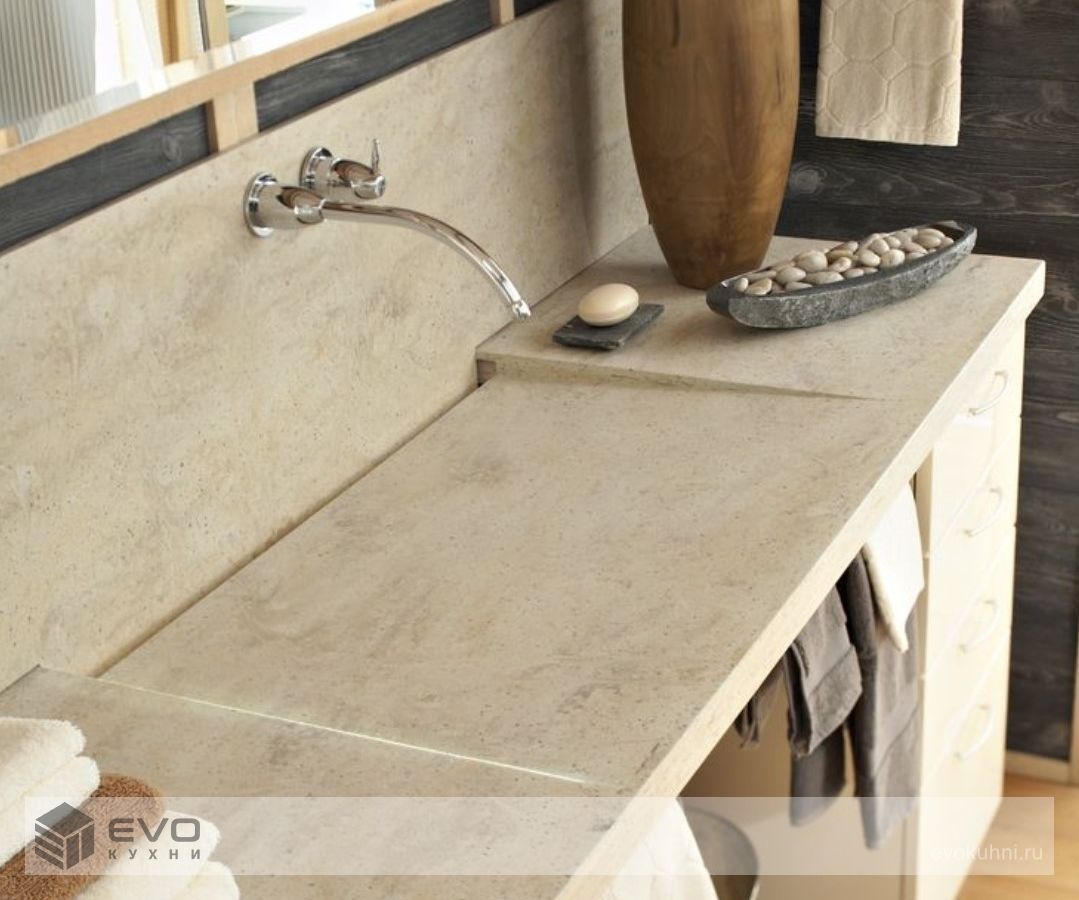 Дизайнеров этот материал привлекает тем, что при термообработке ему можно придать любую форму, поэтому из него зачастую производятся разнообразные элементы декора. Чаще всего, изделия из данного вида искусственного камня применяются в интерьерах ванных комнат, кухонь, для изготовления мебели, осветительных приборов, подоконников, при облицовке стен.