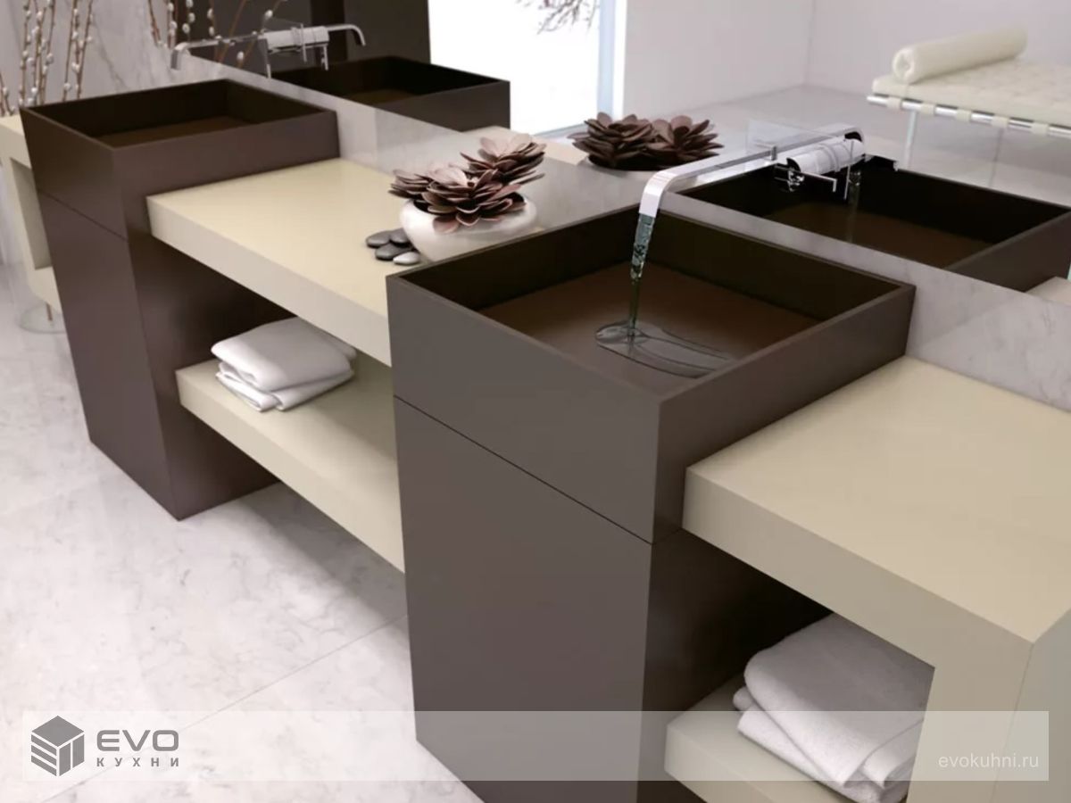 Дизайнеров этот материал привлекает тем, что при термообработке ему можно придать любую форму, поэтому из него зачастую производятся разнообразные элементы декора. Чаще всего, изделия из данного вида искусственного камня применяются в интерьерах ванных комнат, кухонь, для изготовления мебели, осветительных приборов, подоконников, при облицовке стен.