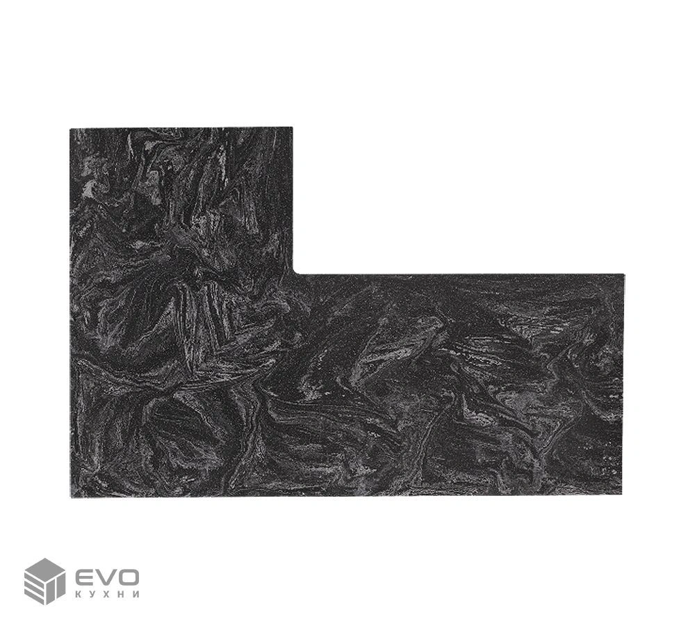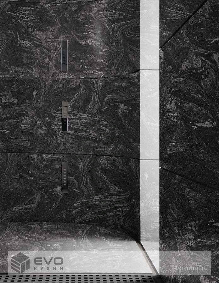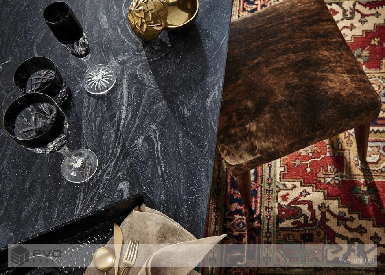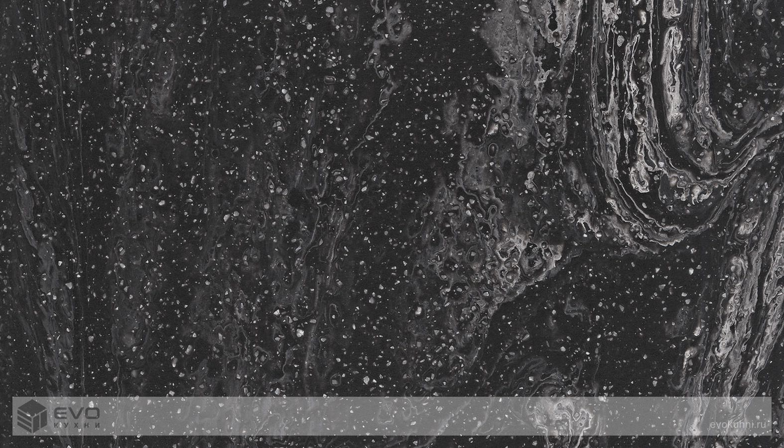 Этот смелый и бездонный, как вселенная, оттенок позволяет создать фоновую поверхность богатого черного цвета, на которой сверкают серо-белые полоски и прожилки. Новый образ будит в воображении тему космоса.