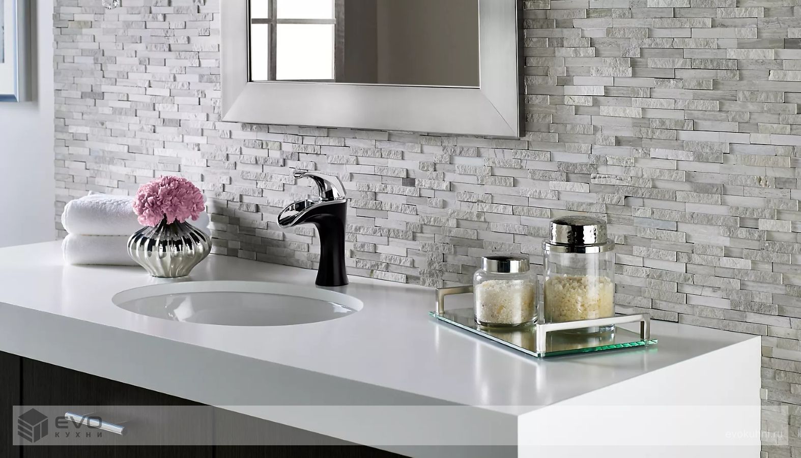 Дизайнеров этот материал привлекает тем, что при термообработке ему можно придать любую форму, поэтому из него зачастую производятся разнообразные элементы декора. Чаще всего, изделия из данного вида искусственного камня применяются в интерьерах ванных комнат, кухонь, для изготовления мебели, осветительных приборов, подоконников, при облицовке стен.