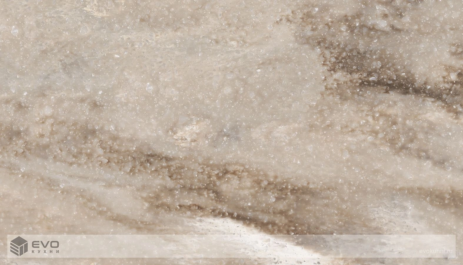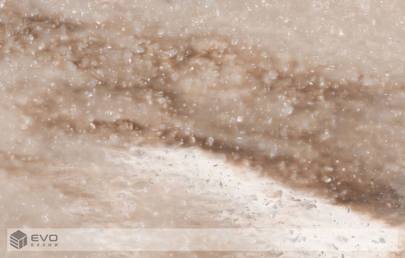 Corian Sandalwood имеет теплую полупрозрачную основу, по которой как бы стекают теплые темно-серые прожилки, а множество вкраплений из светлых частиц создают эффект капелек воды.