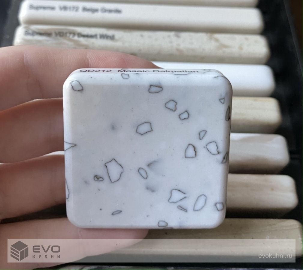 Искусственный камень Staron QD212 Mosaic Dalmatian отличает белоснежный тон и оригинальные крупные белые чипы в тонком темно-сером контуре. Данный камень часто выбирают для изготовления кухонных столешниц и стеновых панелей. Оригинальные разводы мозаики коллекции Mosaic на белом или темном варианте выгодно выделяются среди обилия стандартных моделей.