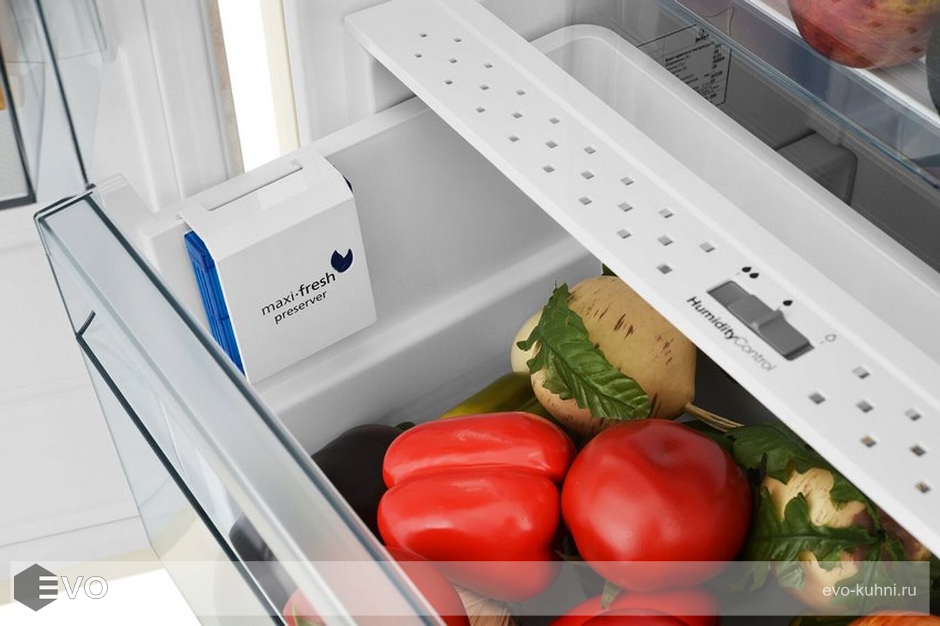 Технология Maxi Fresh Помогает дольше сохранять пищу свежей, поглощая этиленовый газ (биопродукт, выделяющийся естественным образом из свежих продуктов) и неприятные запахи из отделения для овощей.
