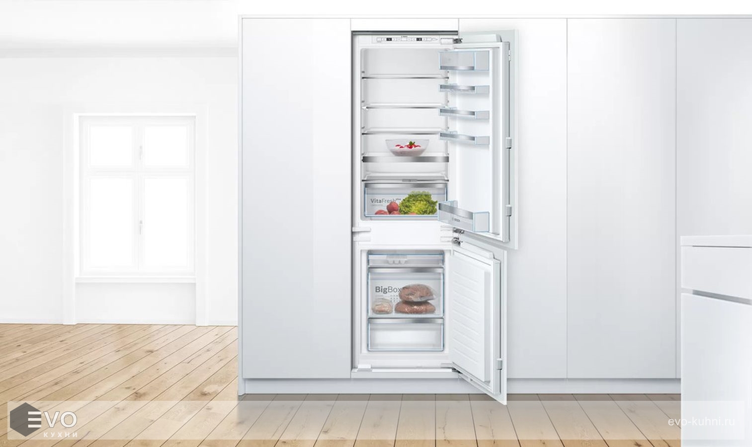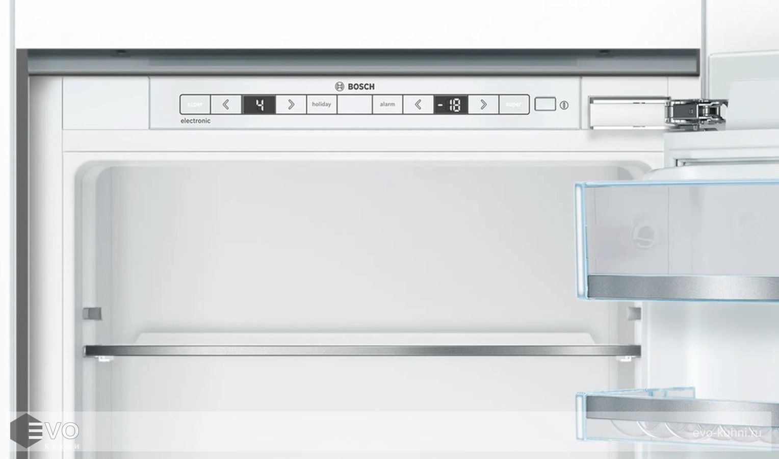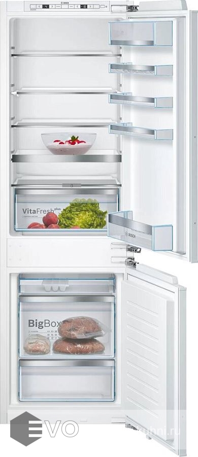 Встраиваемый двухкамерный холодильник Bosch KIS86AFE0 оснащен дополнительной складной полкой VarioShelf. Имеется выдвижная полка для более удобного хранения продуктов. Контейнер BigBox способен вместить даже огромный торт.