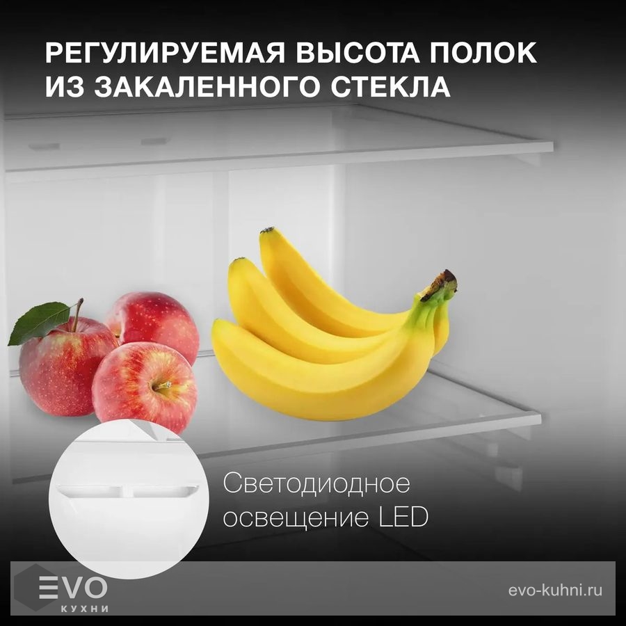 Холодильная камера укомплектована 4 полками из закаленного стекла и ящиком для овощей. Предусмотрено суперохлаждение.