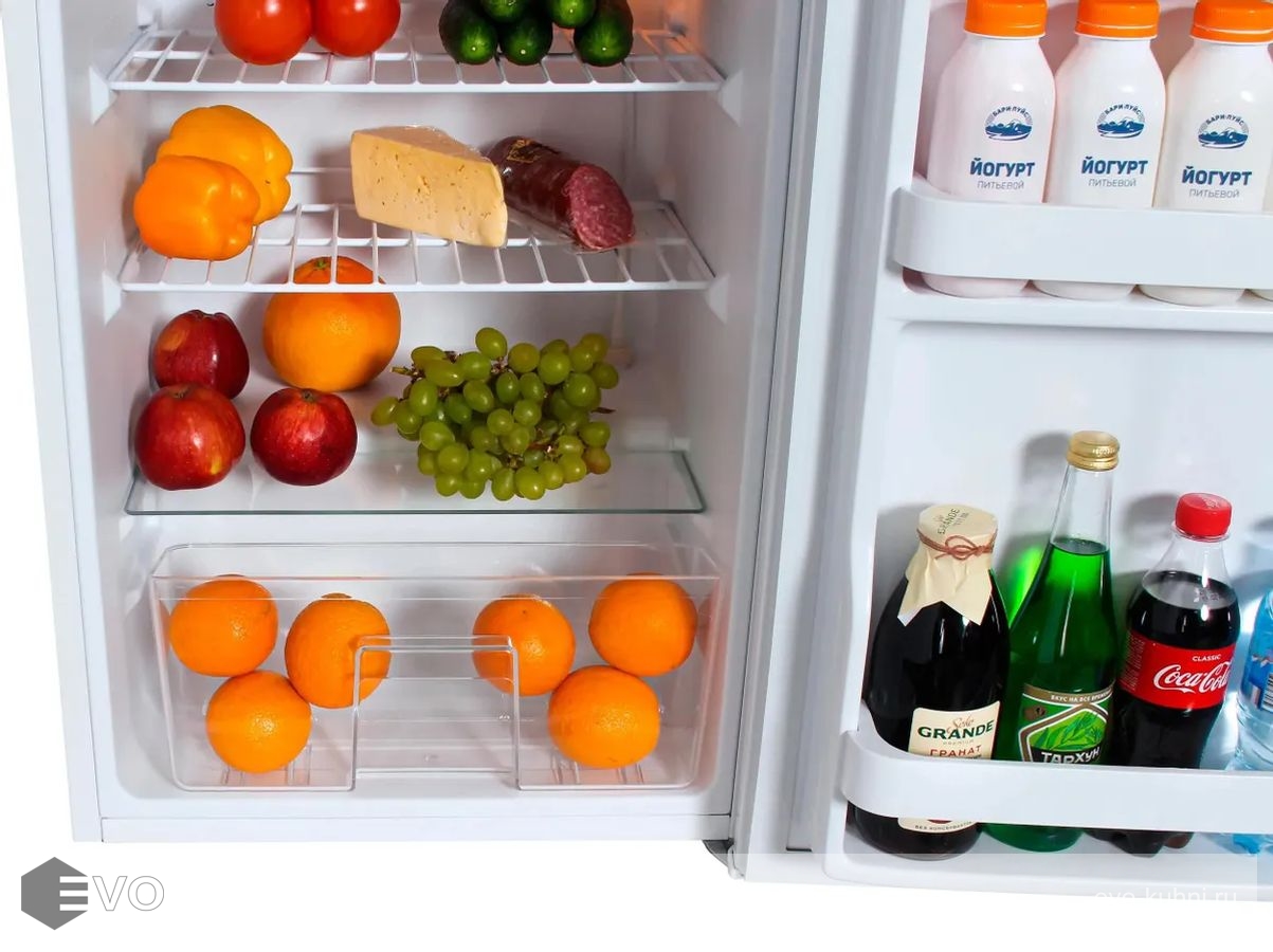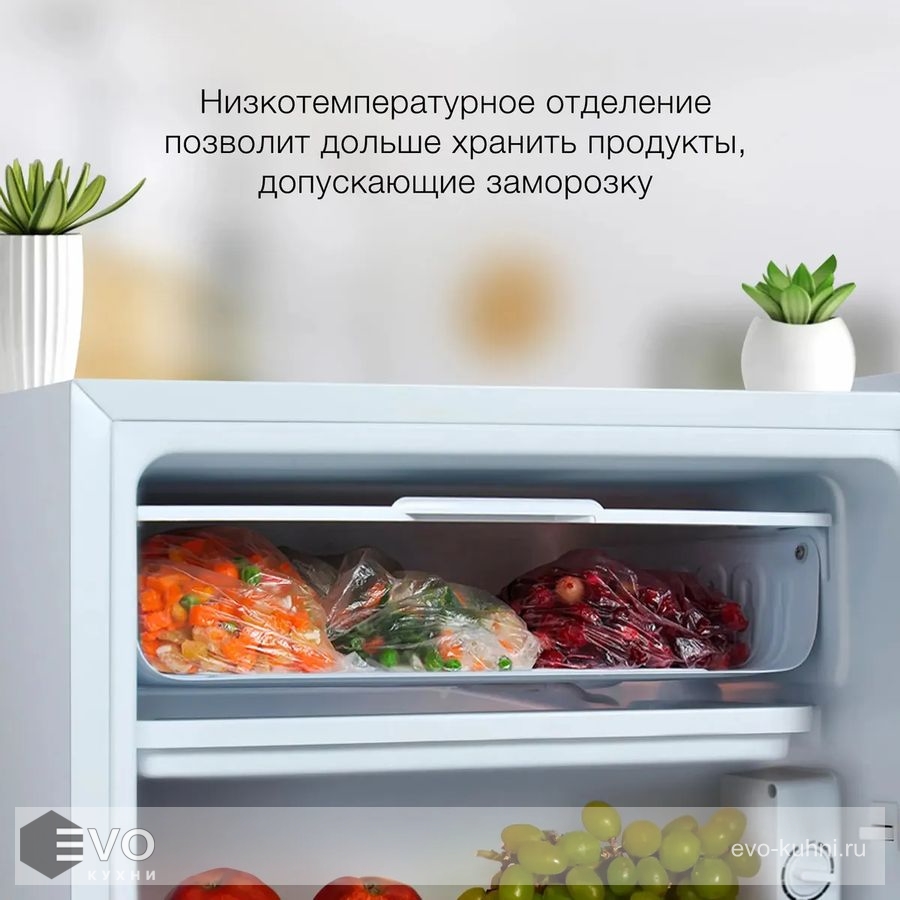 Конденсатор на задней стенке закрыт кожухом, поэтому холодильник получится придвинуть к стене вплотную. Его верхнюю часть можно использовать для установки микроволновой печи или чайника.
