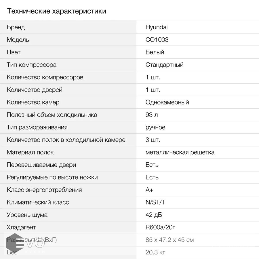 Hyundai CO1003 имеет однокамерную конструкцию. Вместо морозильной камеры у него есть отделение, где поддерживается самая низкая температура, но ее достаточно лишь для того, чтобы сохранить до ужина пачку пельменей или купленное утром на рынке мясо. Также его удобно использовать для быстрого охлаждения напитков.