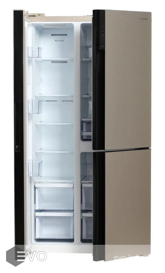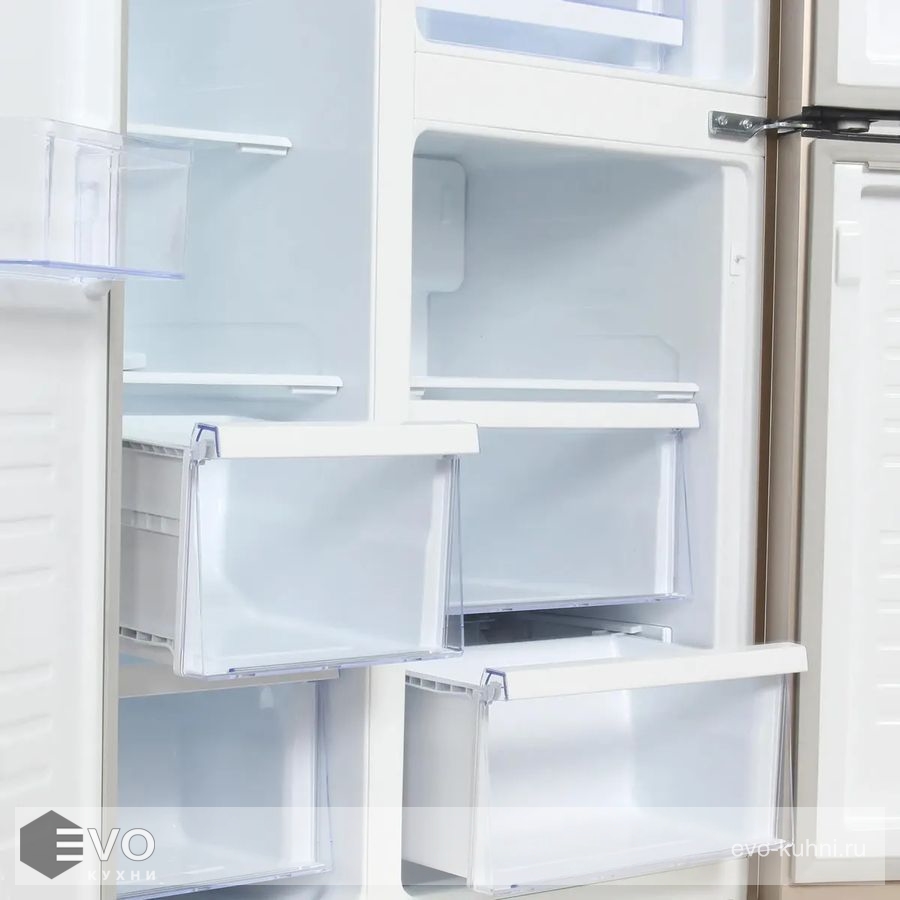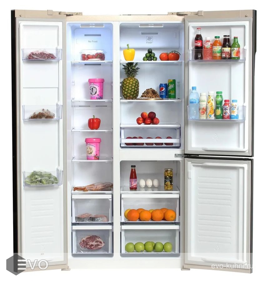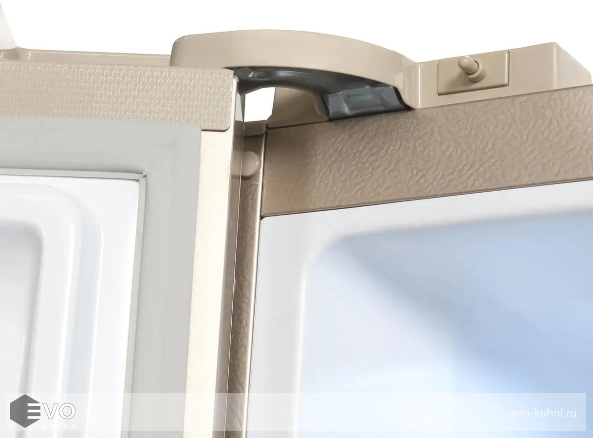 Холодильник в цвете «шампань» имеет солидную вместительность, полезный объем составляет 552 литра. Благодаря этому в нем можно разместить большое количество продуктов и напитков в холодильном отсеке.