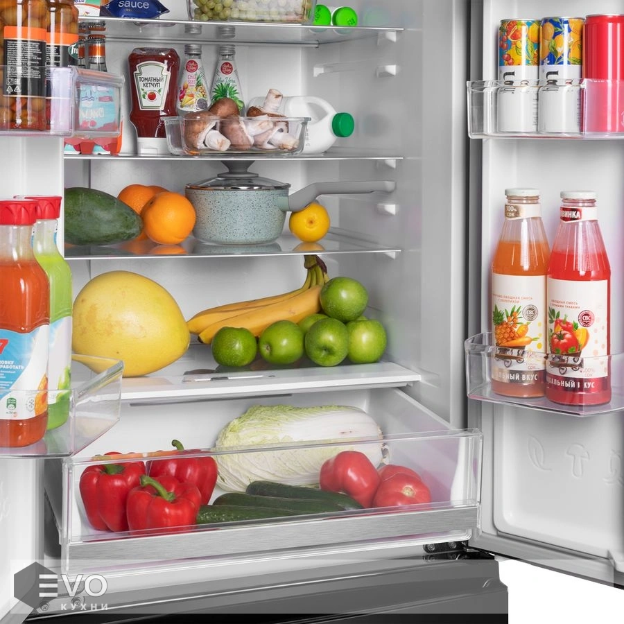 С интеллектуальной технологией Total No Frost вы навсегда забудете о необходимости вручную размораживать холодильник и морозильную камеру. Благодаря равномерному распределению холодного воздуха в камере и на продуктах не образуется лёд. Полки из закалённого ударопрочного стекла позволяют хранить крупные и габаритные продукты и тяжёлую посуду. Полки оснащены стильными металлическими фреймами. И это не только декоративный элемент, придающий холодильнику современный вид: фреймы защищают от трещин и сколов, а также препятствуют стеканию жидкостей в случае их пролития. Регулируемые по высоте полки позволяют легко группировать продукты по типу.