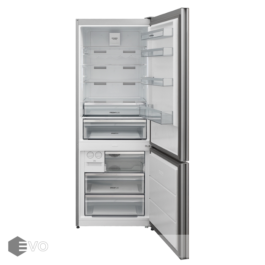 В холодильной камере большое количество крепких полок, на которых можно разместить даже тяжелые кастрюли и сковороды. На двери расположены полочки с высокими бортиками, на них можно поставить бутылки и не бояться, что от резкого открытия двери они сдвинутся или выпадут. Для хранения овощей, фруктов и зелени предусмотрено два вместительных ящика: один в зоне свежести, другой с контролем влажности. Вы можете создавать идеальные условия для разных продуктов.