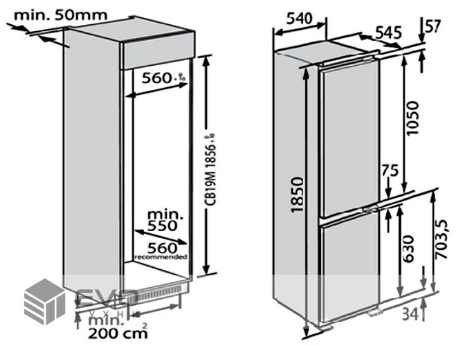 • Размеры холодильника (ШxВxГ), мм: 540 x 1850 x 545