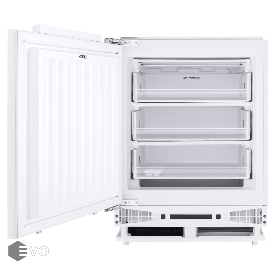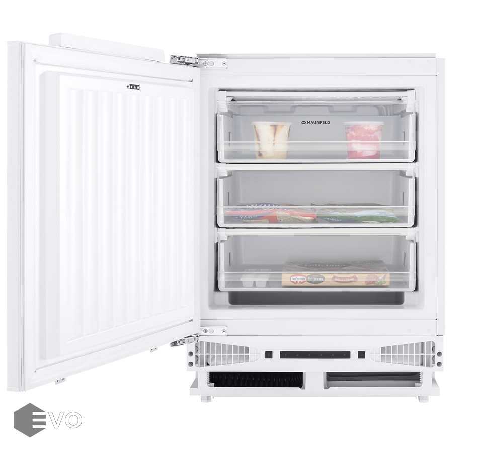 Морозильник встраиваемый MAUNFELD MBFR88SW – встраиваемый морозильник высотой 88 см и объемом 99 л., корпус шириной 60 см сделан из металла. Внутренняя часть выполнена из антибактериального белого пластика легкой очистки. Для удобства загрузки, укомплектован 3 выдвижными ящиками. В комплекте есть емкость для льда.