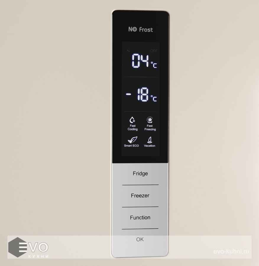 На сенсорном дисплее Вы можете выбрать: температуру холодильника (+2°C до +8°C), температуру морозилки (-16°C до -24°C), режим «Быстрая заморозка», режим «LECO», режим «Отпуск», режим «Смарт».