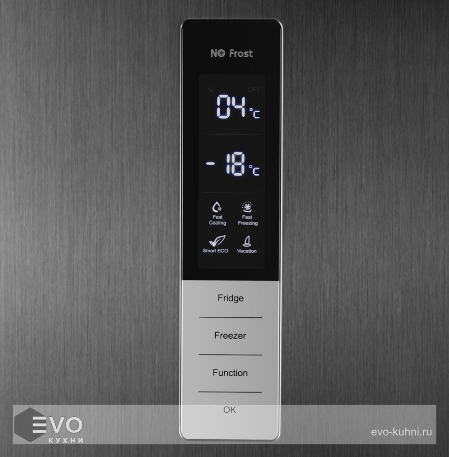 Дисплей с сенсорным управлением находится на передней панели холодильника. Вы можете активировать: выбор температуры холодильника (+2°C до +8°C), выбор температуры морозилки (-16°C до -24°C), функцию «Быстрая заморозка», функцию «Быстрая охлаждение», функцию «Отпуск», функцию «Смарт».