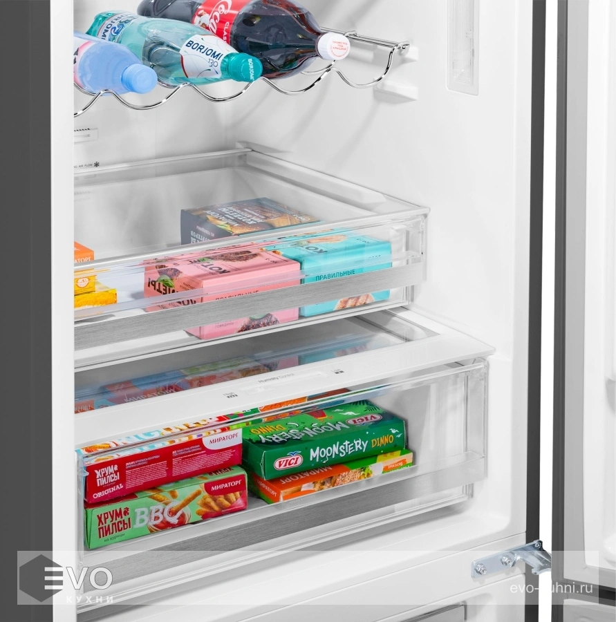 Функция Humidity control позволяет регулировать уровень влажности в зоне свежести, благодаря чему овощи и фрукты дольше хранятся. Вы можете выбрать на дисплее с сенсорным управлением: температуру холодильника (+2°C до +8°C), температуру морозилки (-16°C до -24°C), функцию «Быстрая замораживание», функцию «Отпуск», функцию «Смарт».