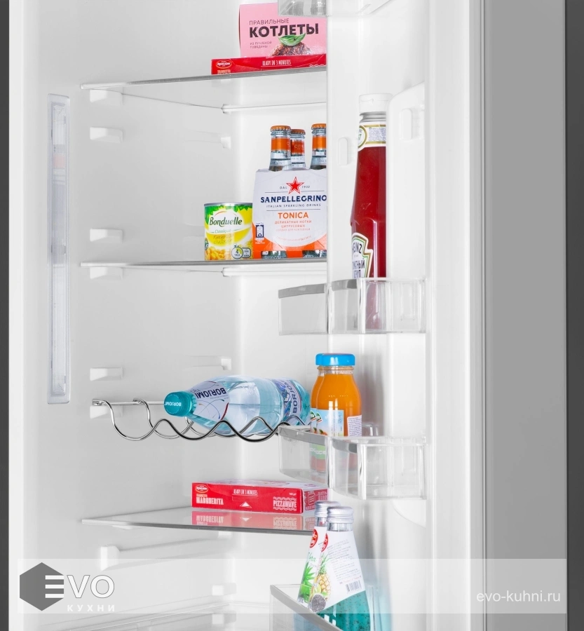1. В холодильной камере находятся: 3 стеклянные полки с металлической окантовкой, 2 большие корзины для фруктов и овощей, 4 боковые полки на дверце, решетка для бутылок. 2 лотка для яиц.