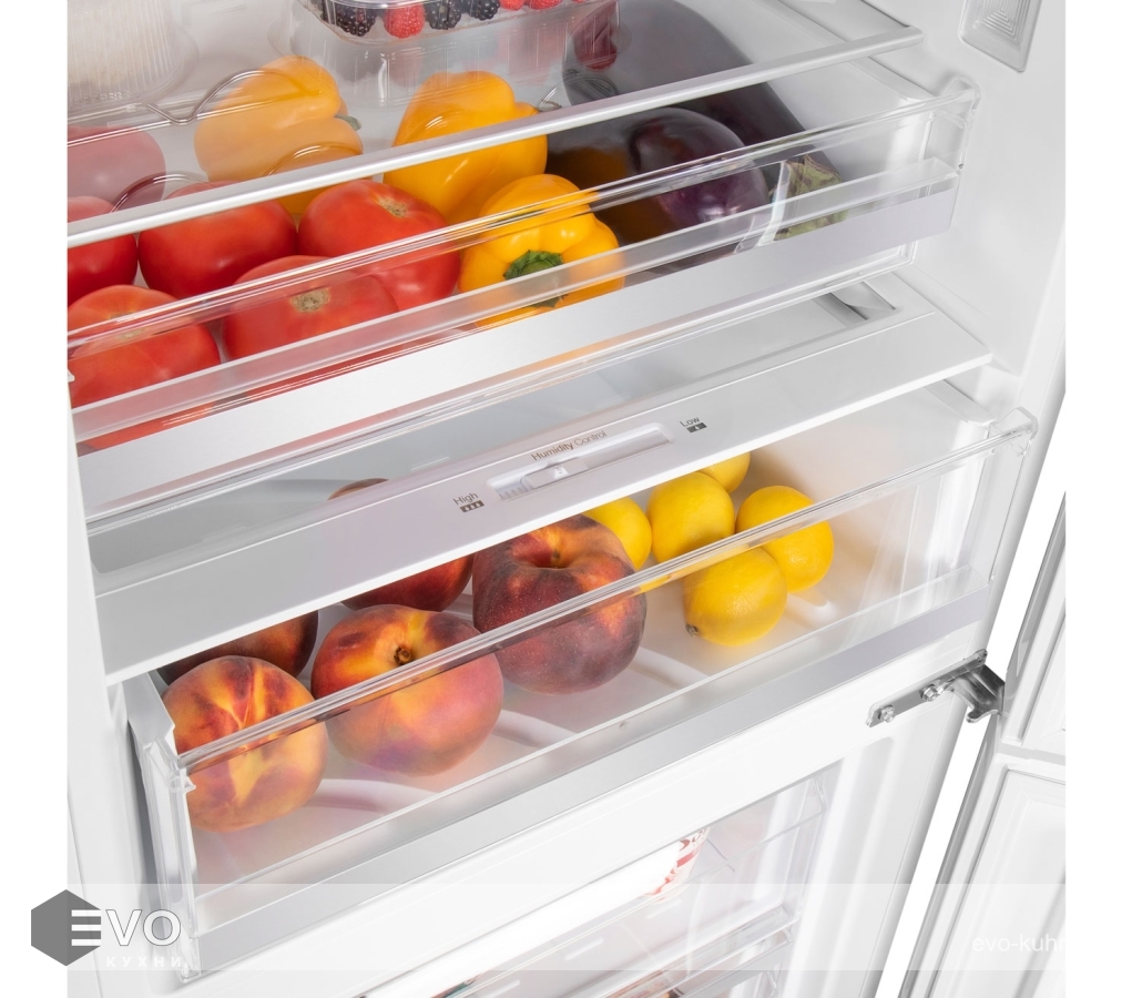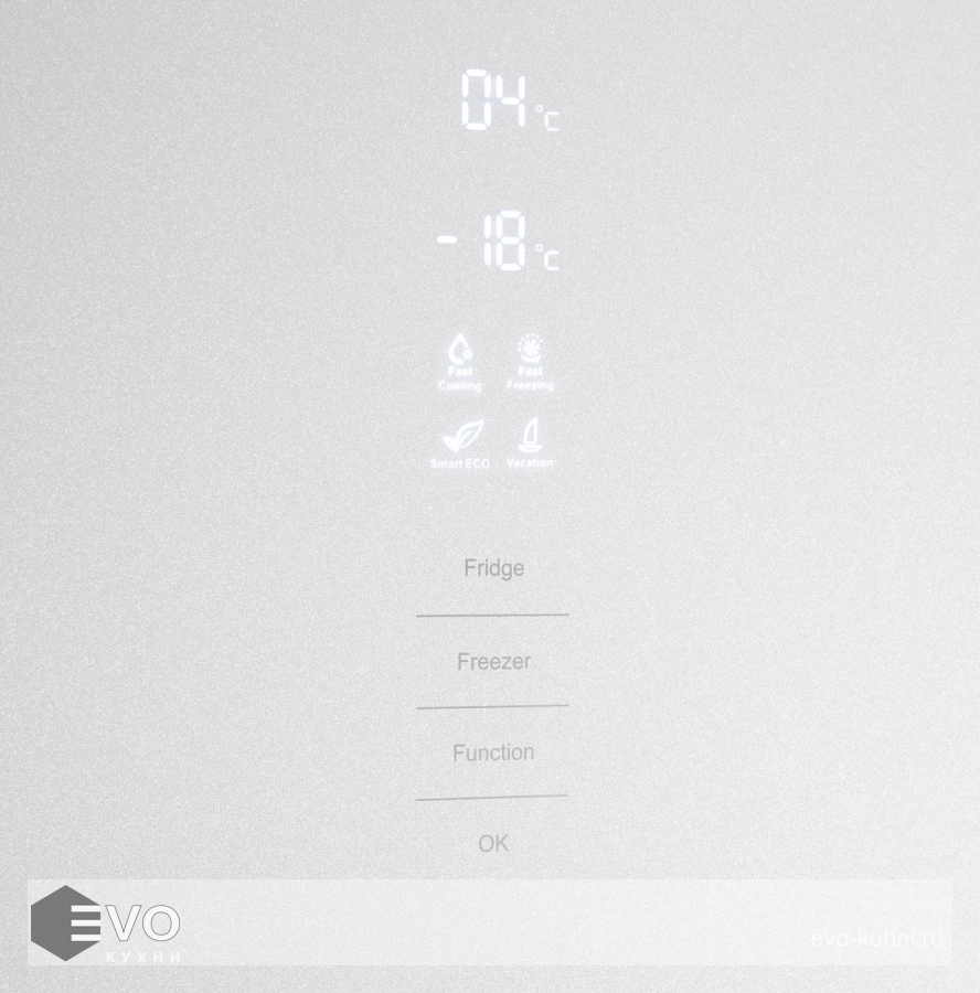 Функция Humidity control позволяет регулировать уровень влажности в зоне свежести, благодаря чему овощи и фрукты дольше хранятся. Вы можете выбрать на дисплее с сенсорным управлением: температуру холодильника (+2°C до +8°C), температуру морозилки (-16°C до -24°C), функцию «Быстрая замораживание», функцию «Отпуск», функцию «Смарт».
