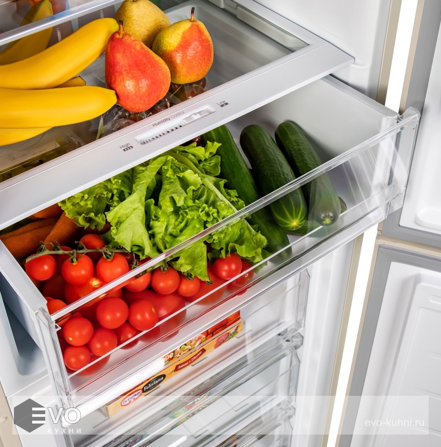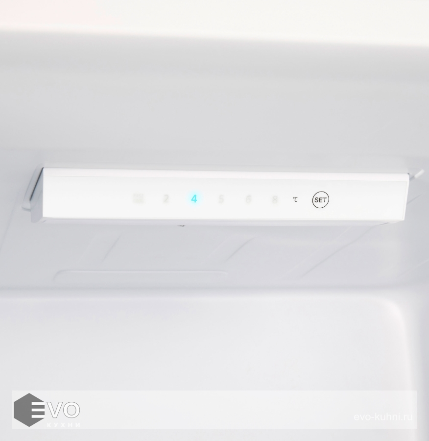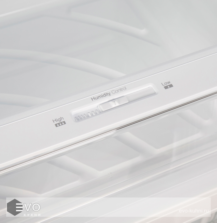 Предусмотрена возможность перенавешивания двери. Сенсорная кнопки выбора температуры (+2°C до +8°C) и быстрого охлаждения морозильной камеры находятся на дисплее в верхней части холодильника. Функция Humidity control позволяет регулировать уровень влажности в зоне свежести, благодаря чему овощи и фрукты дольше хранятся.
