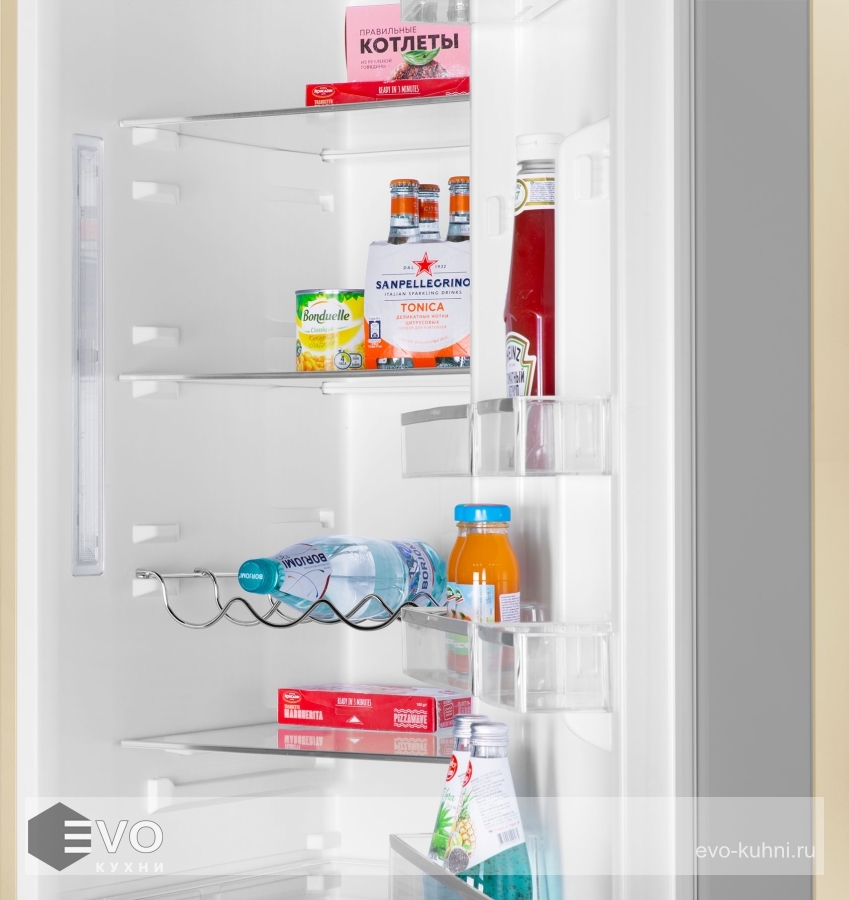1. В верхней холодильной камере находятся: 4 стеклянные полки с металлической окантовкой, одна большая корзина для фруктов и овощей, 4 боковые полки на дверце, решетка для бутылок, 2 лотка для яиц