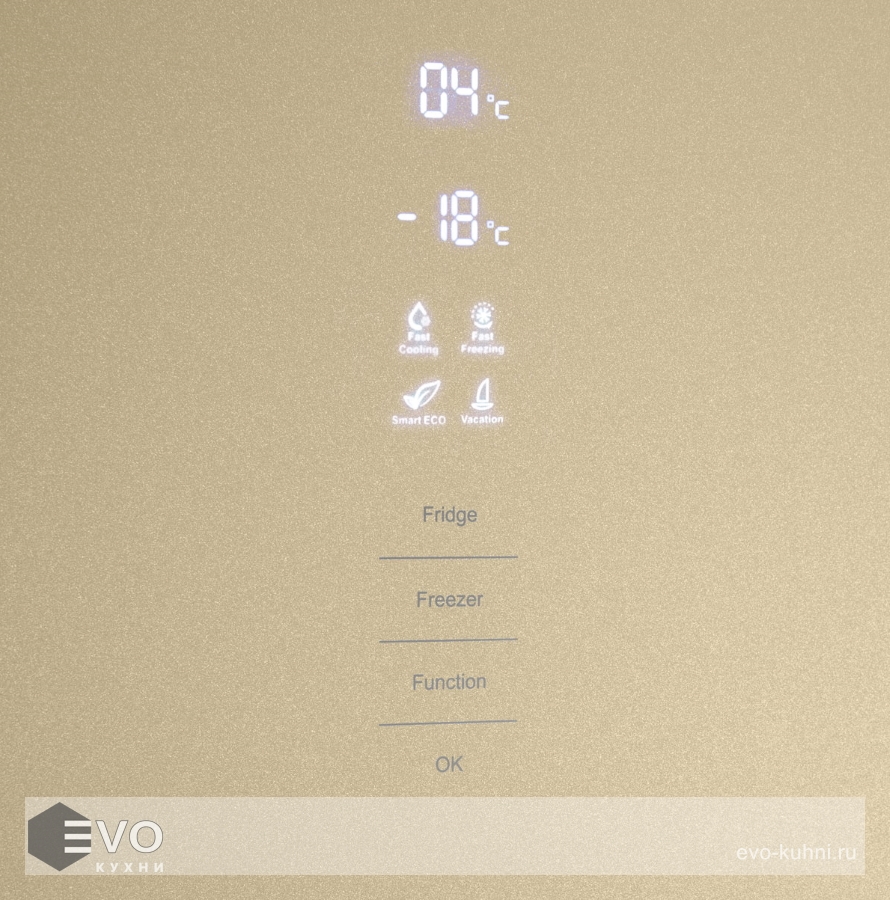 Предусмотрена возможность перенавешивания двери. Температурный режим настраивается индивидуально в каждой камере. На сенсорном дисплее Вы можете выбрать: температуру холодильника (+2°C до +8°C), температуру морозилки (-16°C до -24°C), режим «Быстрая заморозка», режим «Отпуск», режим «Смарт».