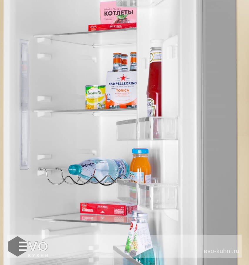 1. В верхней холодильной камере находятся: 4 стеклянные полки с металлической окантовкой, одна большая корзина для фруктов и овощей, одна малая корзина для фруктов и овощей, 6 боковых полок на дверце, решетка для бутылок, 2 лотка для яиц.