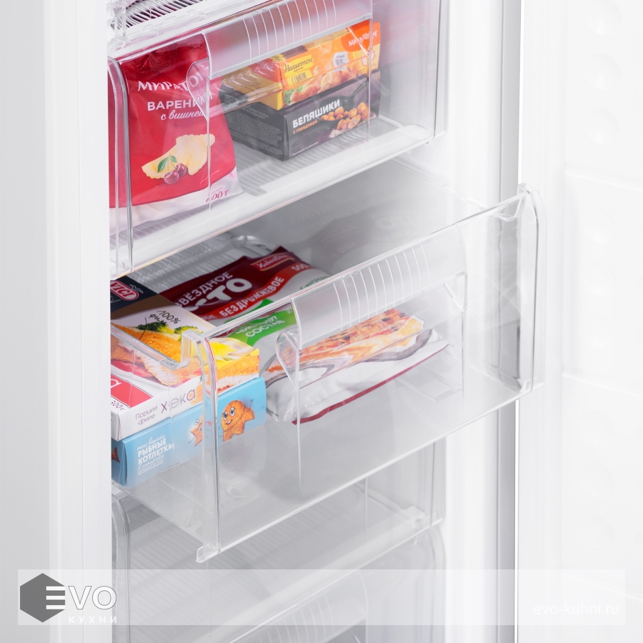 Низкий уровень шума при работе компрессора позволяет устанавливать его в кухне-гостиной. Предусмотрена возможность перевешивания двери. Внутри морозилки находится: 2 полки с крышкой, 4 прозрачных ящика, емкость для льда.