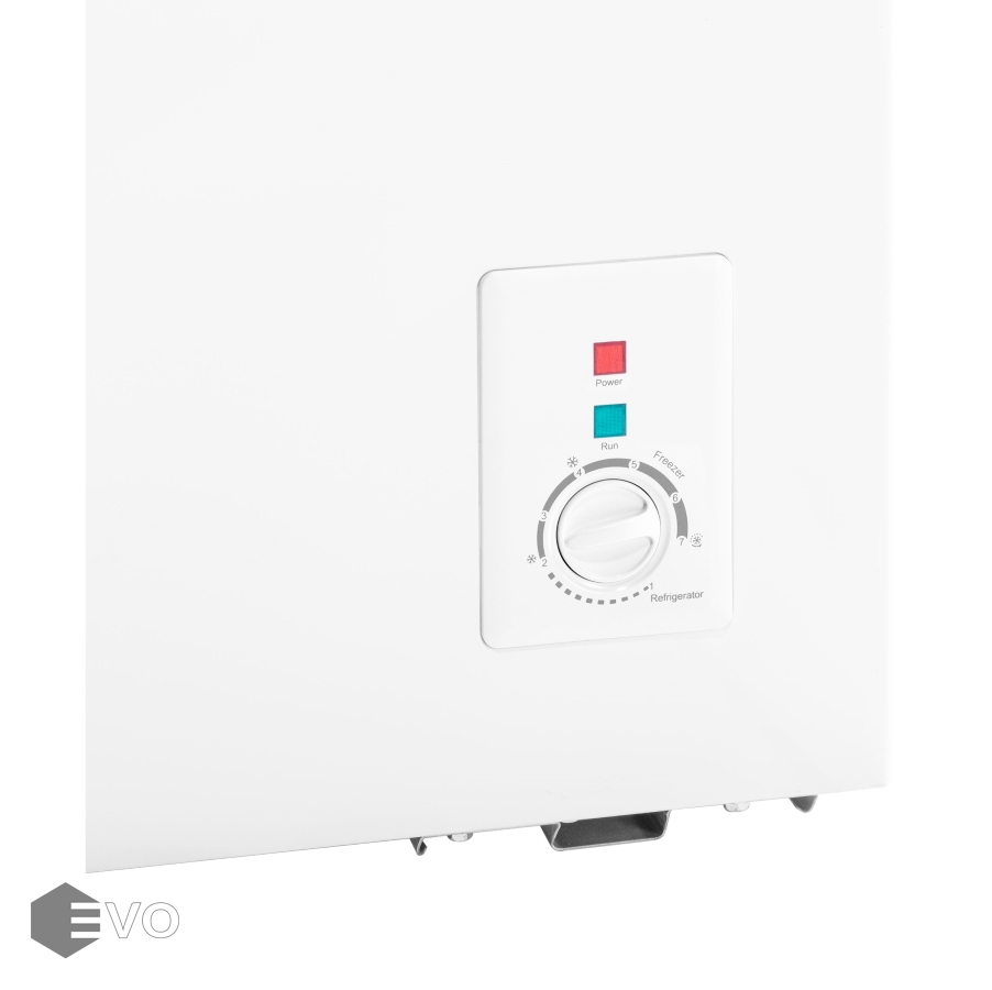 Температура морозильной камеры (от -2℃ до -24℃) регулируется с помощью ручки на термостате, установленном на лицевой стороне ларя. Система охлаждения морозильной камеры - «DeFrost», что потребует от вас размораживать ее всего раз в полгода. Для этого предусмотрено сливное отверстие в нижней части морозильного ларя, закрытое резиновой крышкой.