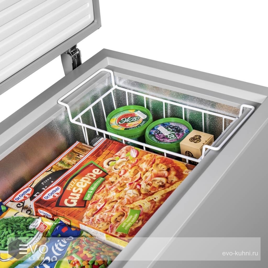 Внутренняя часть выполнена из антибактериального пластика легкой очистки. В комплекте идет эргономичная сетчатая корзина для мелких продуктов и емкость для льда.Морозильный ларь оснащен внешним аналоговым температурным индикатором. Индикаторы показывают, когда работает прибор (горит красный свет) и компрессор (горит зеленый свет).