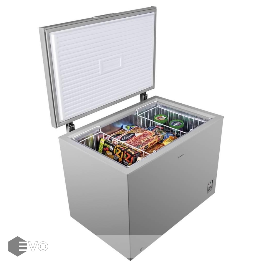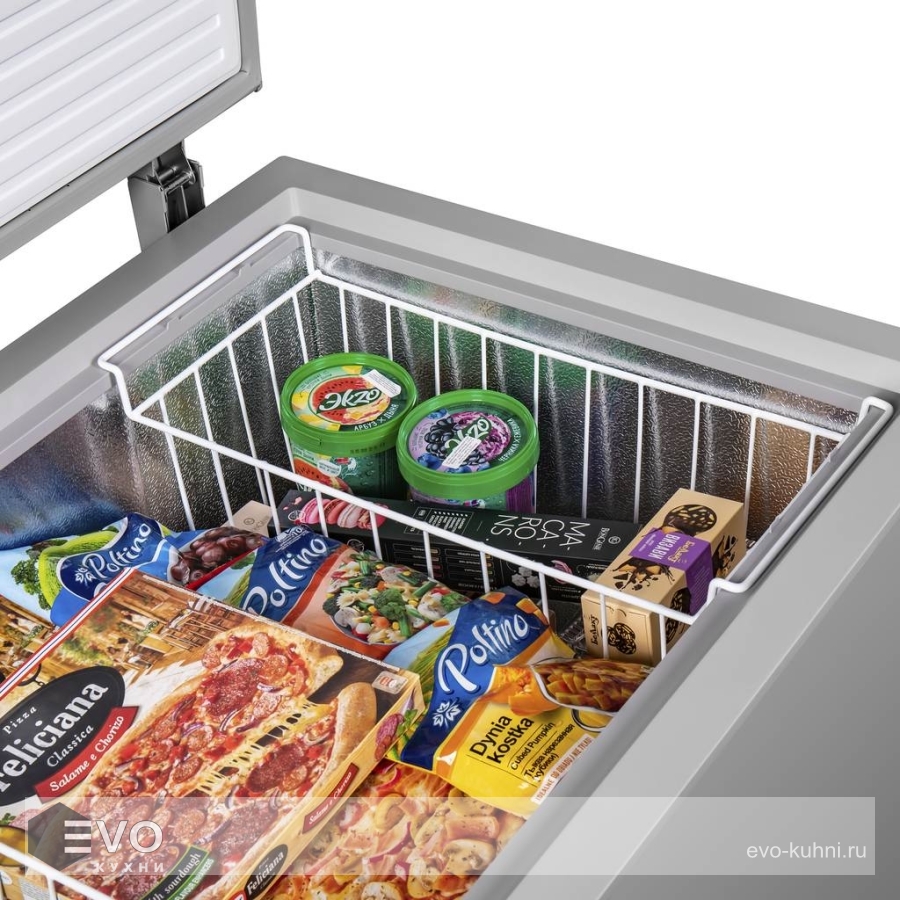 Внутренняя часть выполнена из антибактериального пластика легкой очистки. В комплекте идут две эргономичные сетчатые корзины для мелких продуктов и емкость для льда. Морозильный ларь оснащен внешним аналоговым температурным индикатором. Индикаторы показывают, когда работает прибор (горит красный свет) и компрессор (горит зеленый свет).
