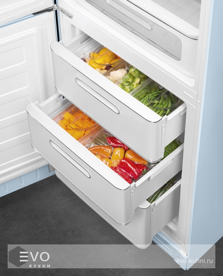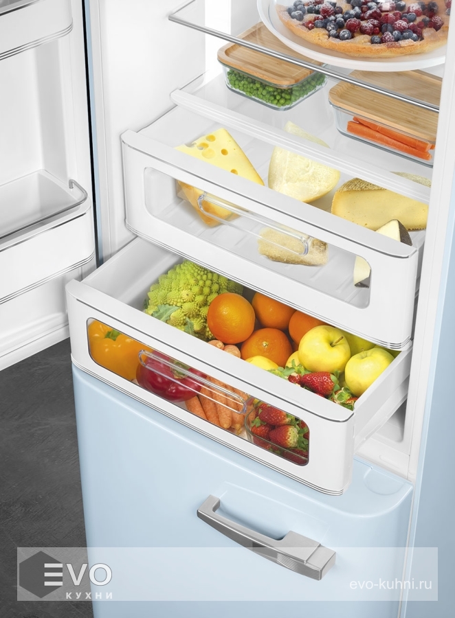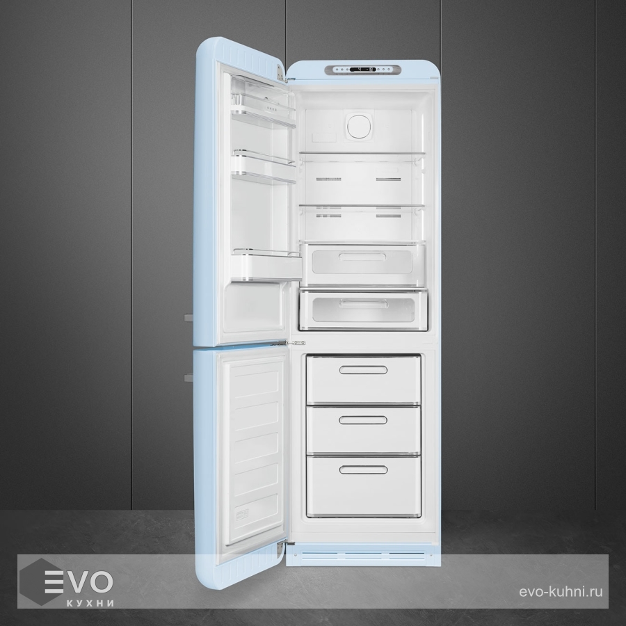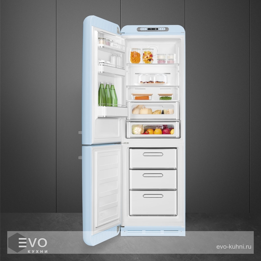 Холодильник Smeg FAB32LPB5 – отдельностоящий, двухдверный холодильник, стиль 50-х годов, характеризуется экономным потреблением электроэнергии, при достаточном объеме, который удовлетворит потребности хранения. Округлые формы и хромированные детали идеально сочетают внутренние и внешние двери холодильника. Профили ящиков на дверях и стеклянных полок имеют яркие хромированные элементы с ретро-дизайном.