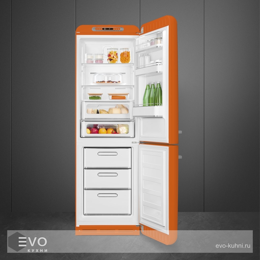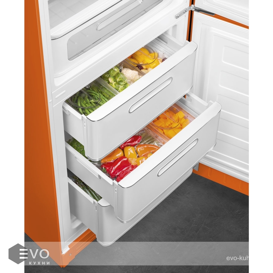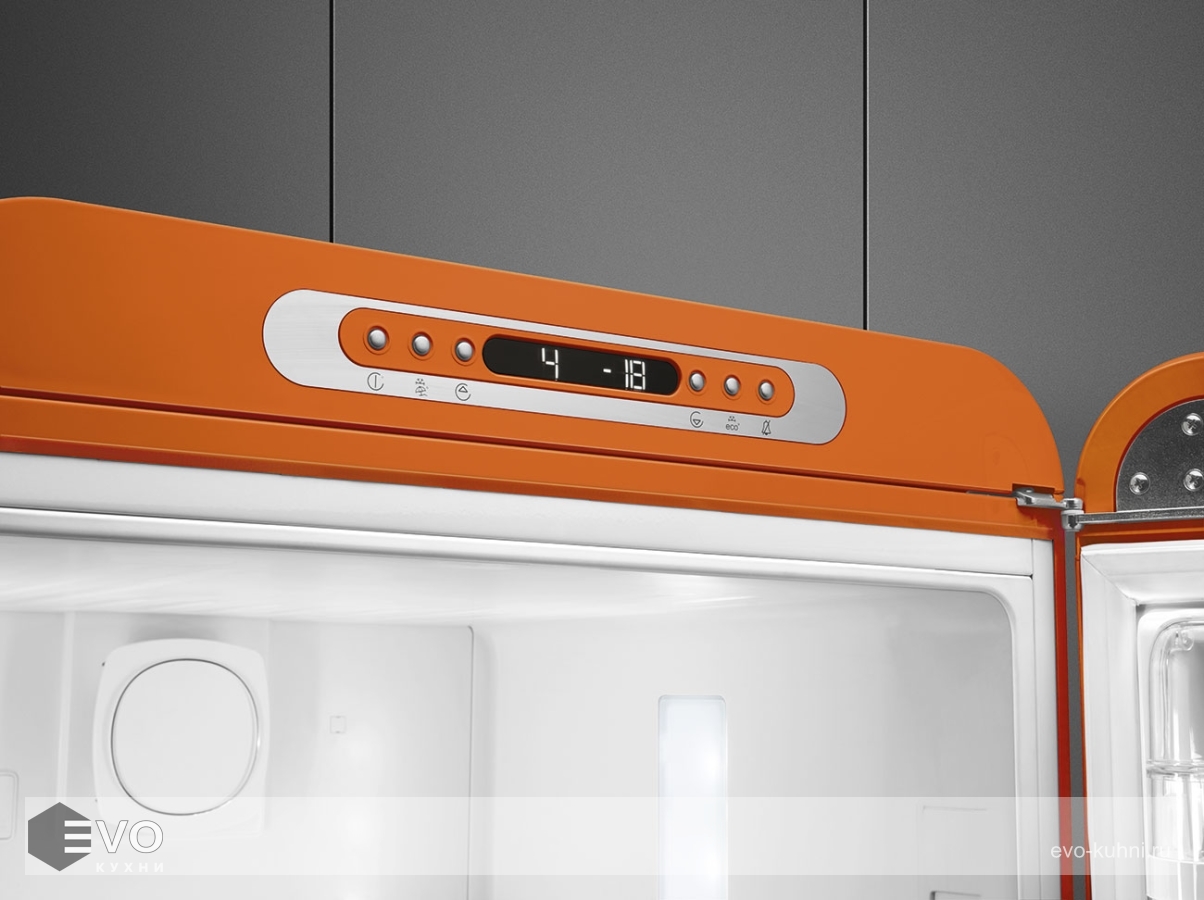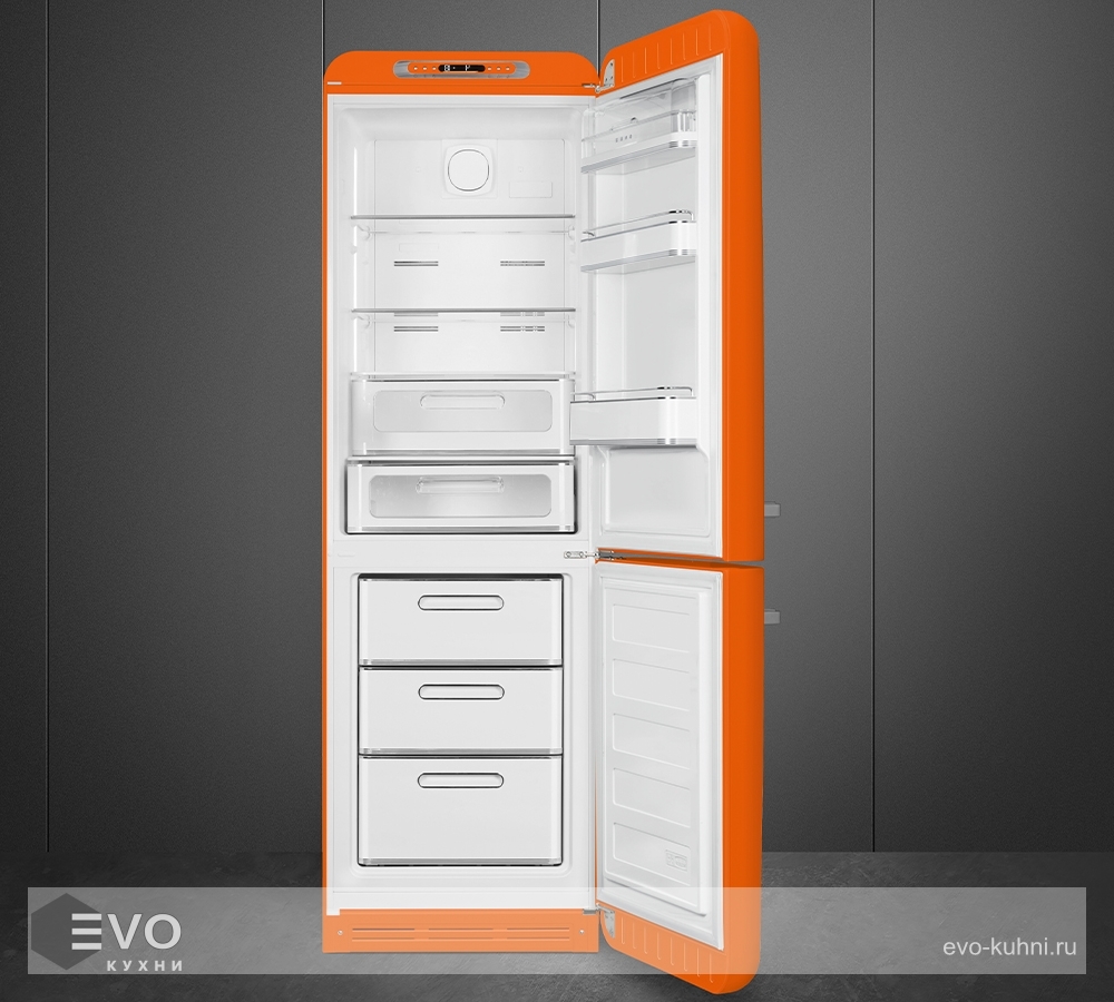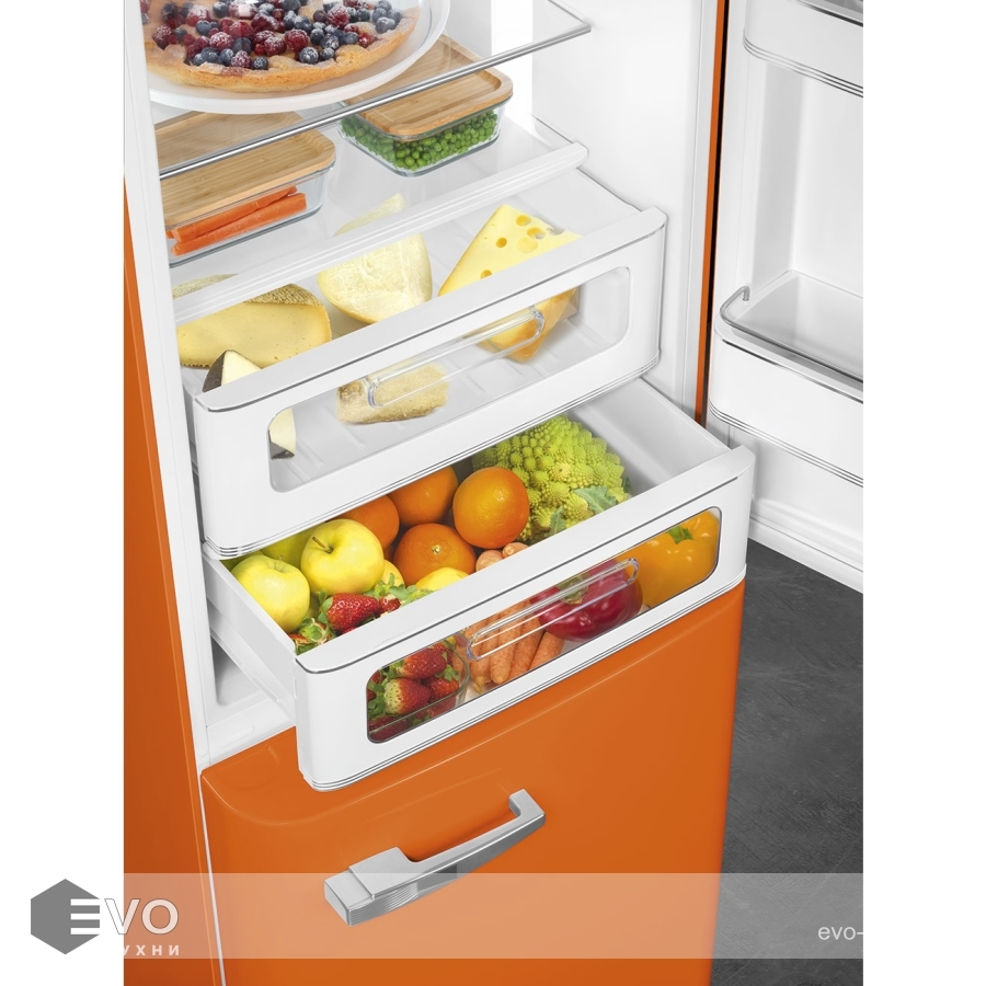 Холодильник Smeg FAB32ROR5 – отдельностоящий, двухдверный холодильник, стиль 50-х годов, характеризуется экономным потреблением электроэнергии, при достаточном объеме, который удовлетворит потребности хранения. Округлые формы и хромированные детали идеально сочетают внутренние и внешние двери холодильника. Профили ящиков на дверях и стеклянных полок имеют яркие хромированные элементы с ретро-дизайном.