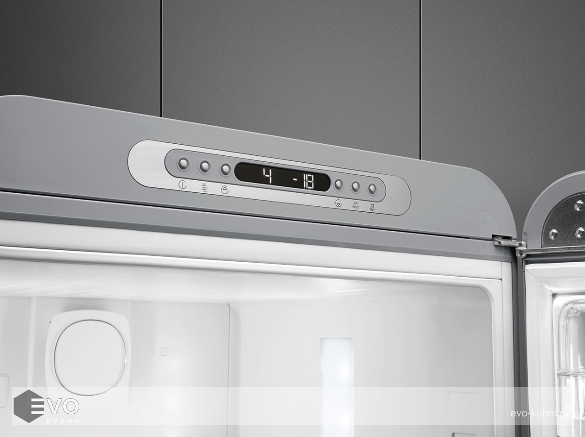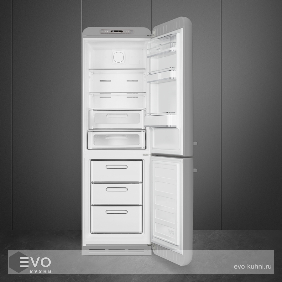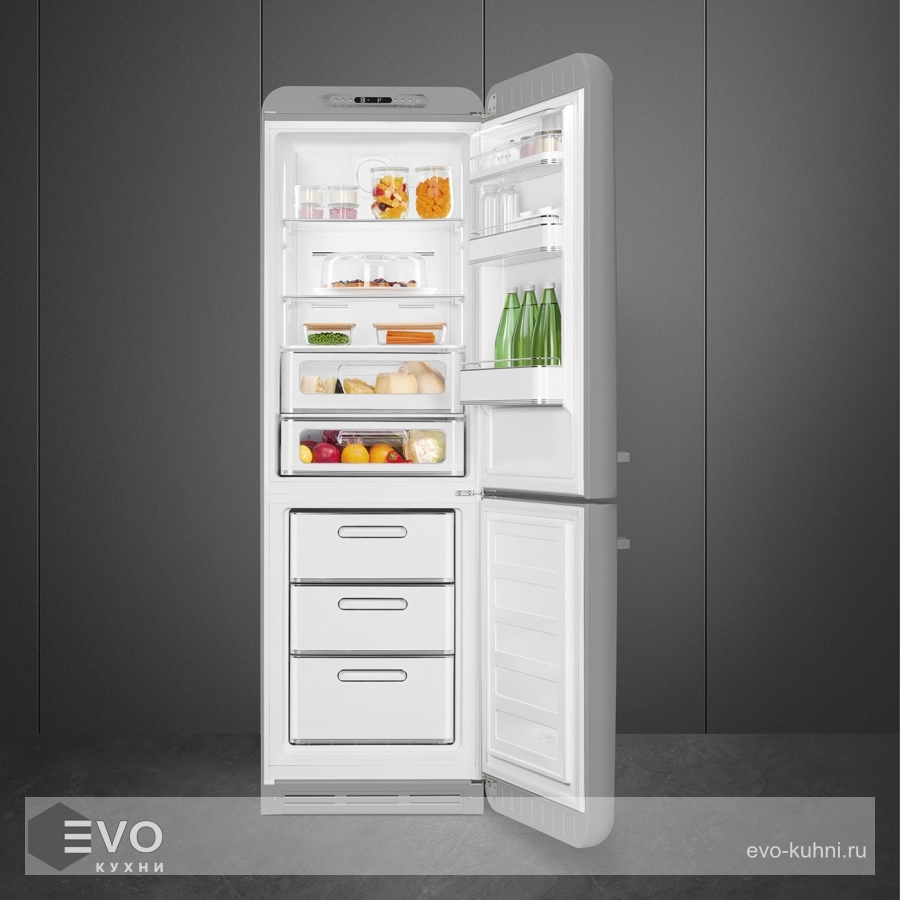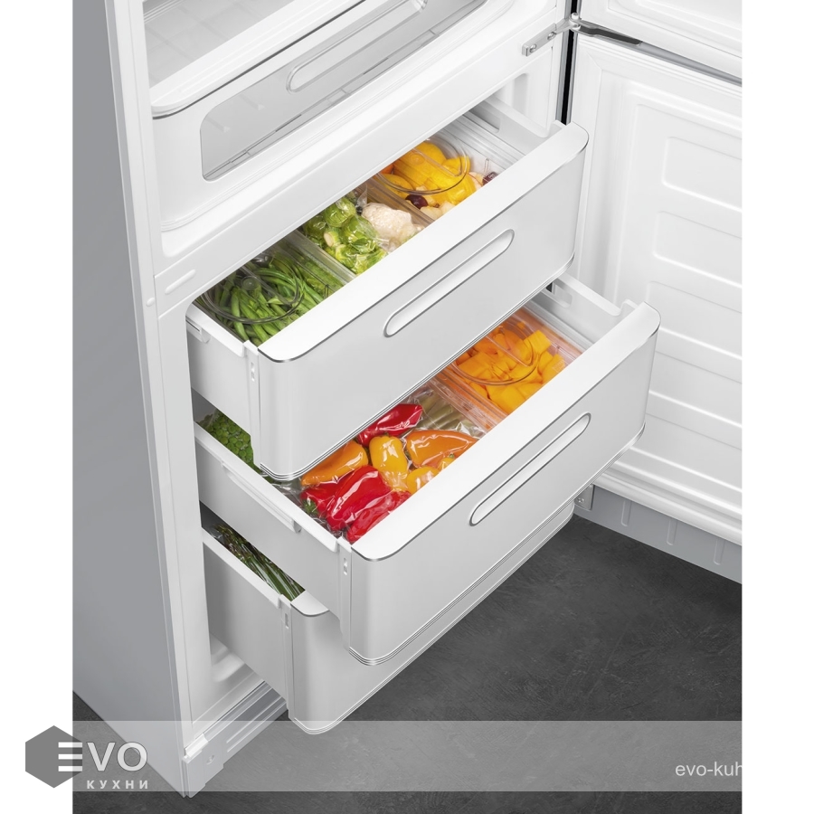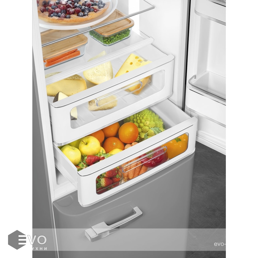 Холодильник Smeg FAB32RSV5 – отдельностоящий, двухдверный холодильник, стиль 50-х годов, характеризуется экономным потреблением электроэнергии, при достаточном объеме, который удовлетворит потребности хранения. Округлые формы и хромированные детали идеально сочетают внутренние и внешние двери холодильника. Профили ящиков на дверях и стеклянных полок имеют яркие хромированные элементы с ретро-дизайном.