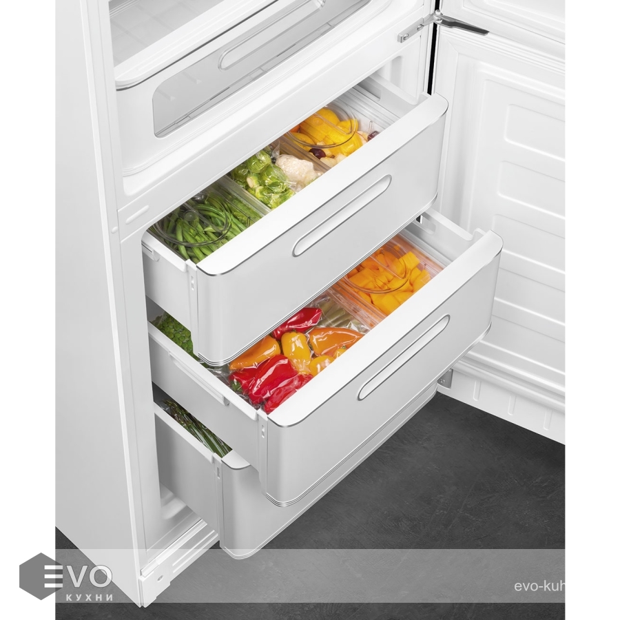Холодильник Smeg FAB32RWH5 – отдельностоящий, двухдверный холодильник, стиль 50-х годов, характеризуется экономным потреблением электроэнергии, при достаточном объеме, который удовлетворит потребности хранения. Округлые формы и хромированные детали идеально сочетают внутренние и внешние двери холодильника. Профили ящиков на дверях и стеклянных полок имеют яркие хромированные элементы с ретро-дизайном.