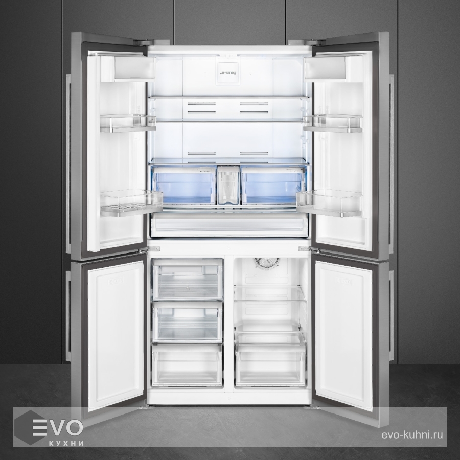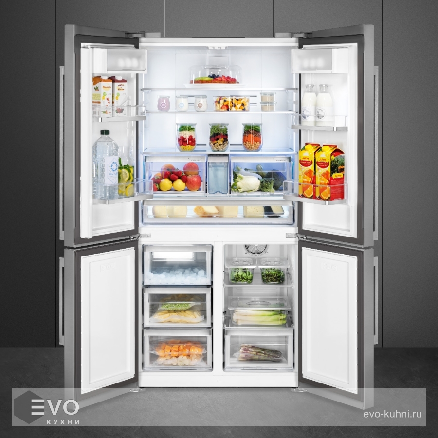 Холодильник Smeg FQ60XDAIF – отдельноятоящий, трехкамерный, имеет четыре дверцы, благодаря своему вместительному внутреннему объему сможет подойти для больших семей. Холодильная и морозильная камеры имеют собственное освещение. Зона сохранения свежести предусмотрена для продления срока годности скоропортящимся продуктам питания. В случае, если температура в агрегате повысится, то прозвучит оповещающий акустический сигнал.