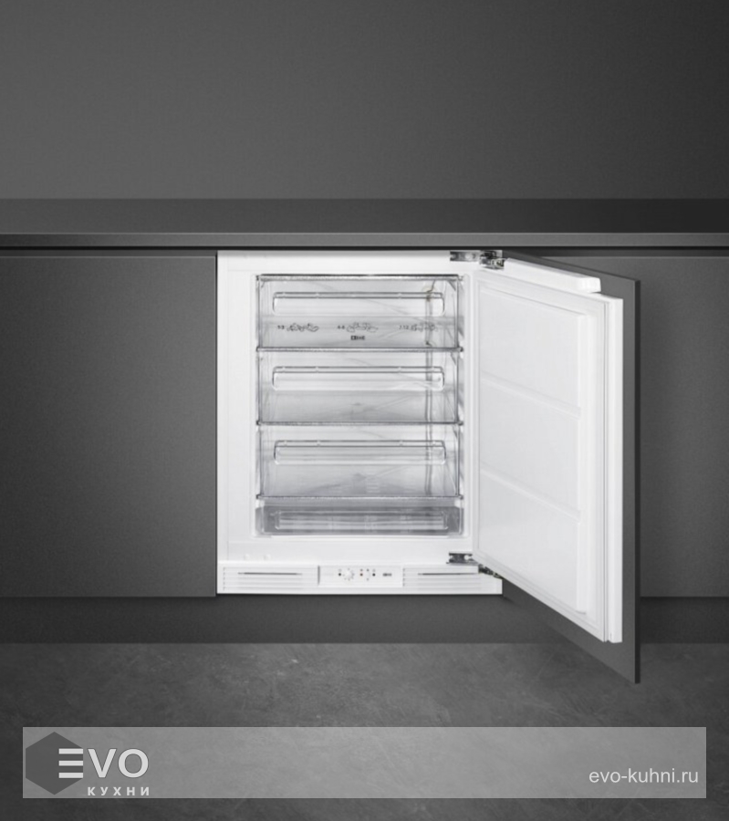 Морозильная камера Smeg U8F082DF1 – встраиваемая морозильная камера с монтажом под столешницу, компактная модель специально разработана для небольших помещений. Камера размораживается вручную, встроен механический регулятор для установки температуры замораживания. Двери можно перенавешивать, передние ножки можно регулировать по высоте.