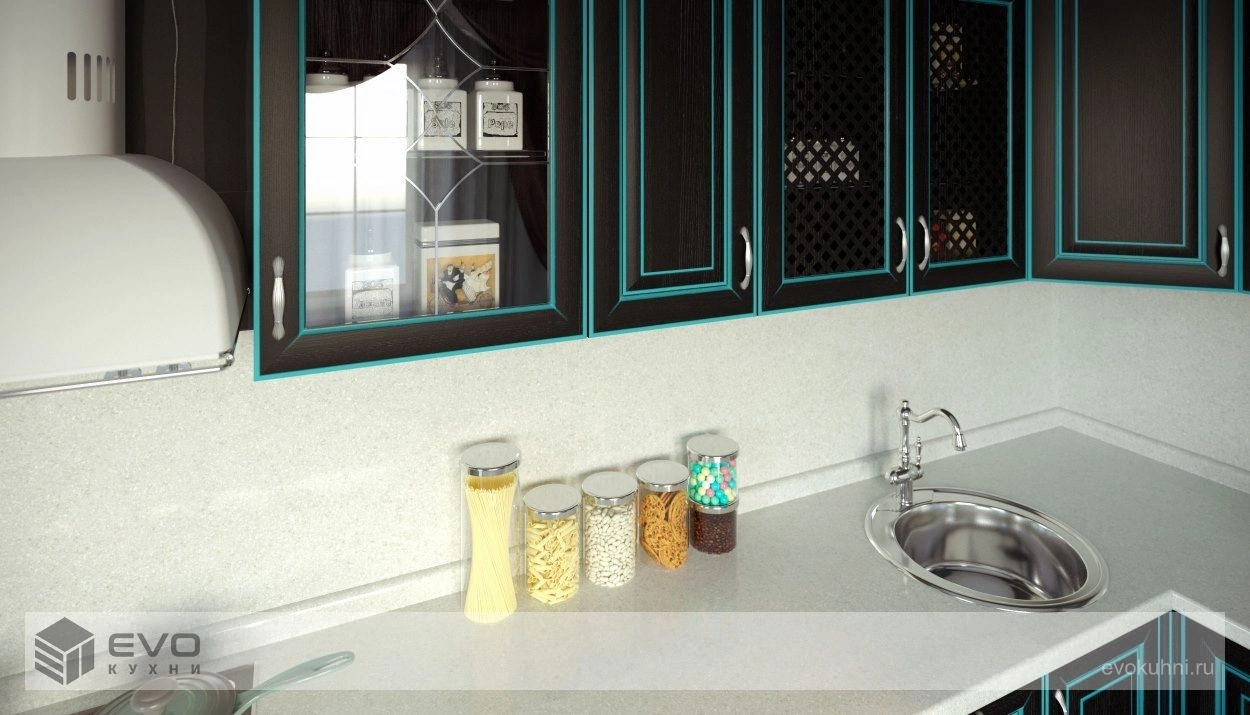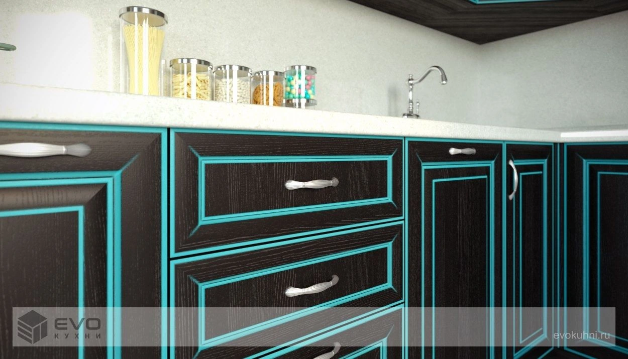 Если вы решили отдать предпочтение классике, а ваша кухня достаточно просторна, черные фасады с яркой патиной Хорд ПП будут смотреться очень элегантно и респектабельно. Роскошное дополнение «гламурного» дизайна кухни в черных тонах – хрустальная люстра или вытяжка, инкрустированная кристаллами. Такие аксессуары придают черной кухни блеск и особый шарм.