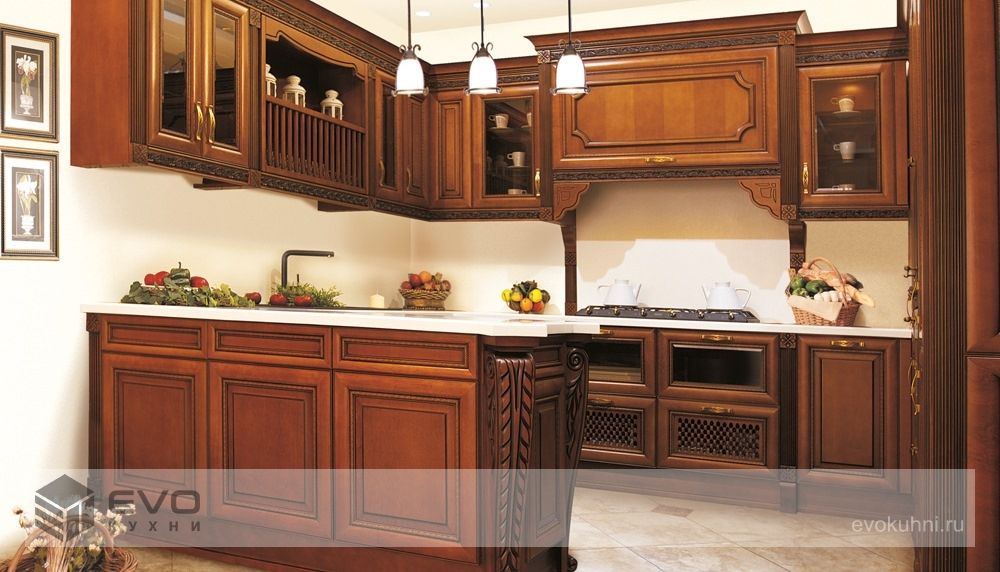 Классический стиль кухонной мебели красиво воплощается в дереве. Гарнитур из ольхи привносит тепло и комфорт в помещение. Мебель из ольхи прочная и долговечная, материал прекрасно поддается резной отделке. Классический гарнитур со стилизацией под старину делает кухню особенно уютной. Прозрачные покрытия как нельзя лучше подчеркивают текстуру дерева. Стеклянные витражи и полочки, частично закрытые деревянной решеткой, придают легкость.