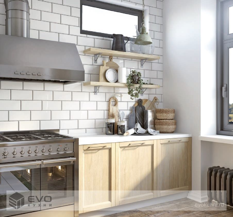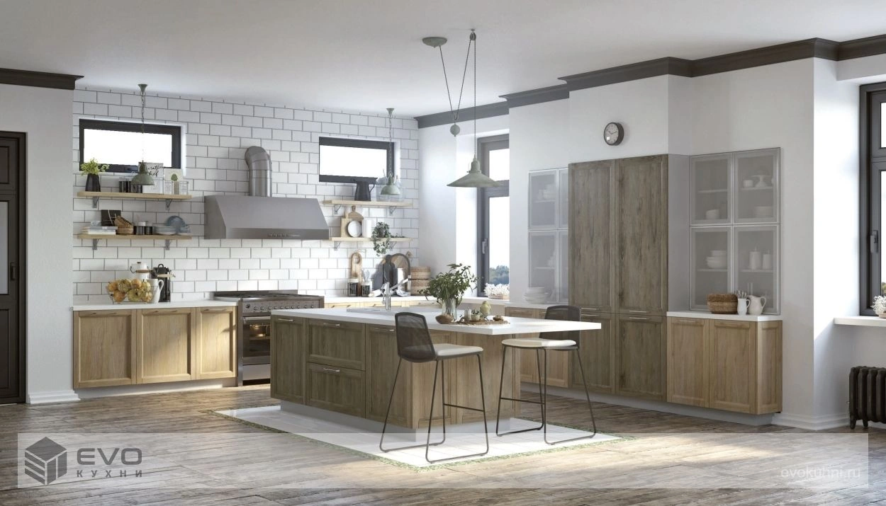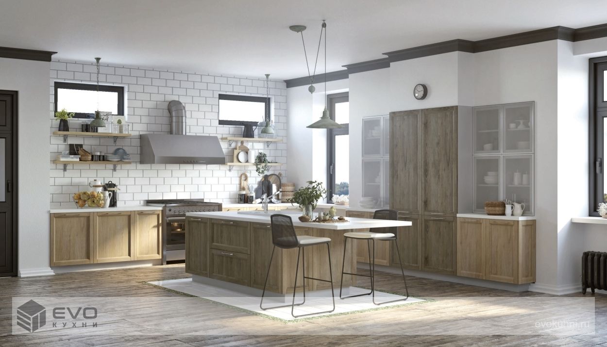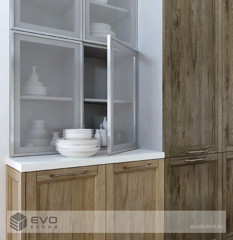 Мягкие природные тона и четкие утилитарные формы данной модели придают интерьеру благородный гармоничный вид. Прямые фасады с имитацией выразительной текстуры древесины являются несомненным трендом уже долгое время. Встроенные в стену шкафы и витрины визуально уравновешивают пространство, наделяя его повышенной функциональностью.