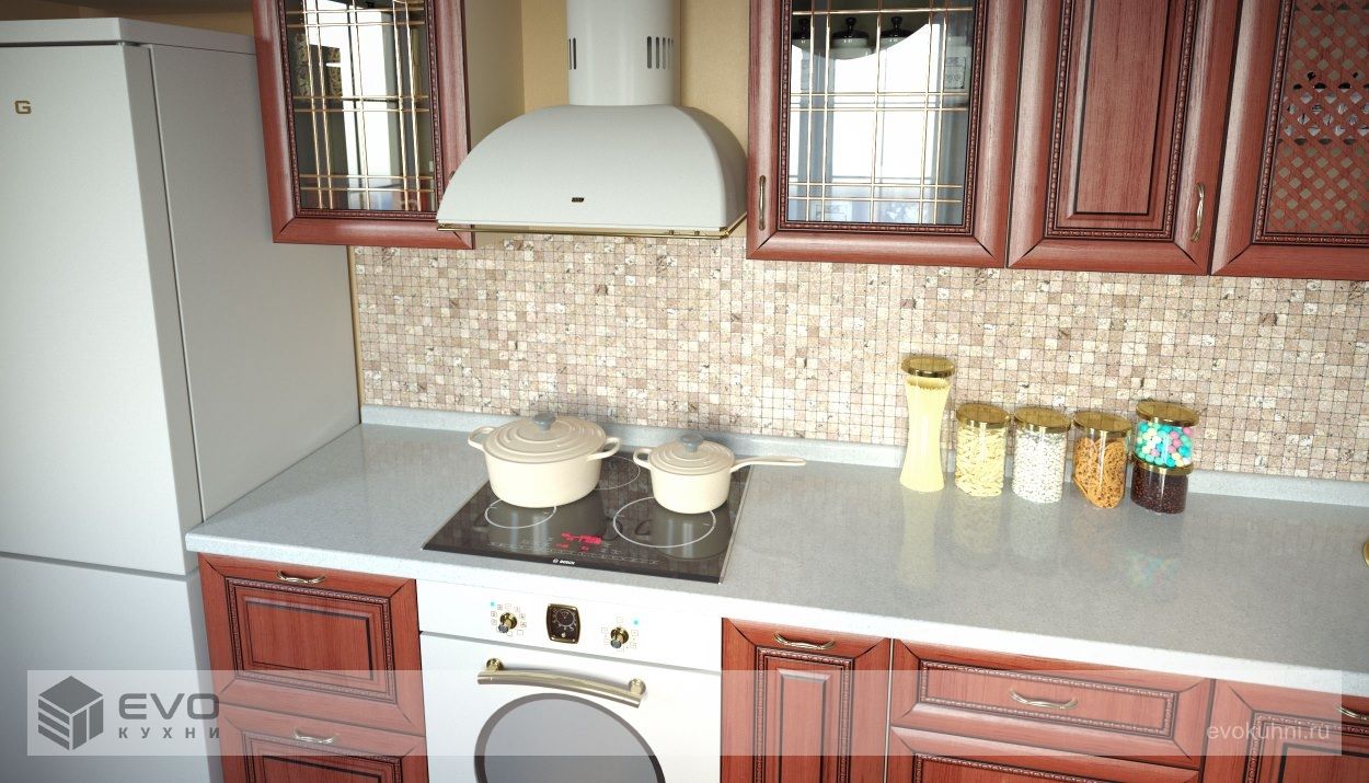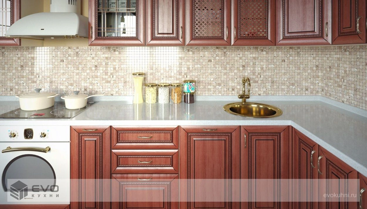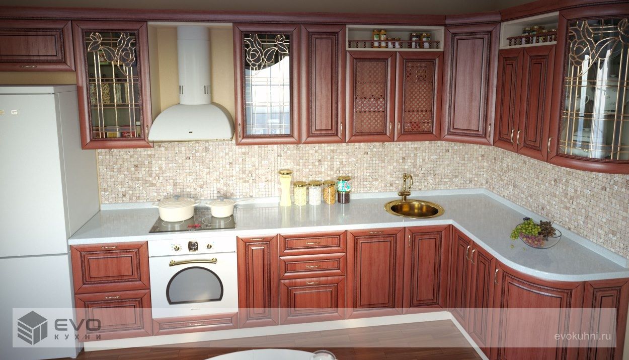 Стеклянные витражи и полочки, частично закрытые деревянной решеткой, придают легкость. Возможность выбрать конфигурацию, которая подходит конкретному помещению, делает кухню универсальной. Она отлично впишется в интерьер загородного дома и небольшой квартиры. Кухню можно превратить в гостиную, подобрав по цвету и стилю столовый гарнитур и другую мебель у нас в салоне кухни EVO Гарнитур понравится людям, которые ценят домашний уют и тепло родного очага. На такой кухне будет приятно проводить семейные ужины и дружеские встречи.