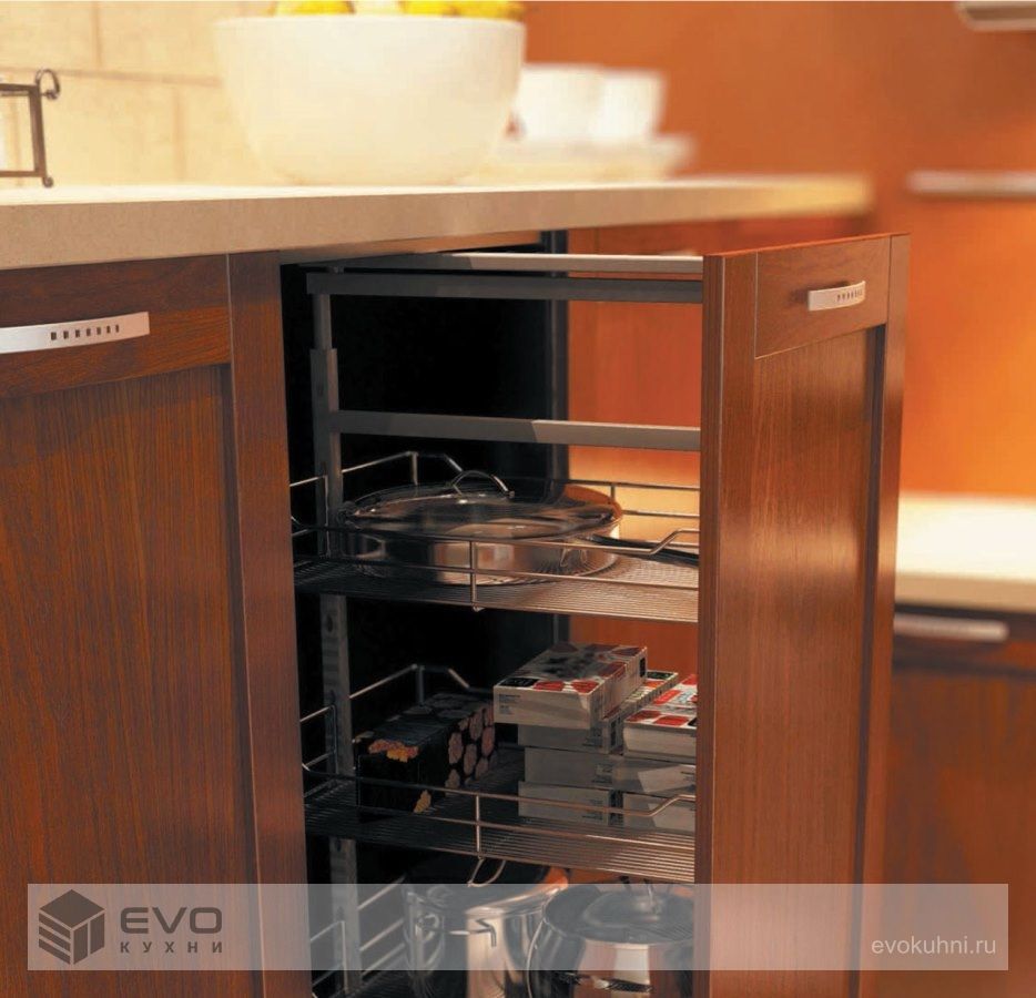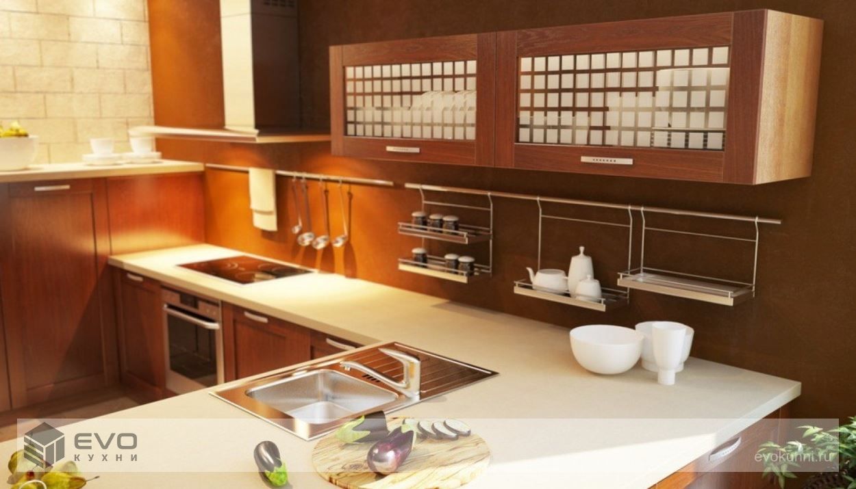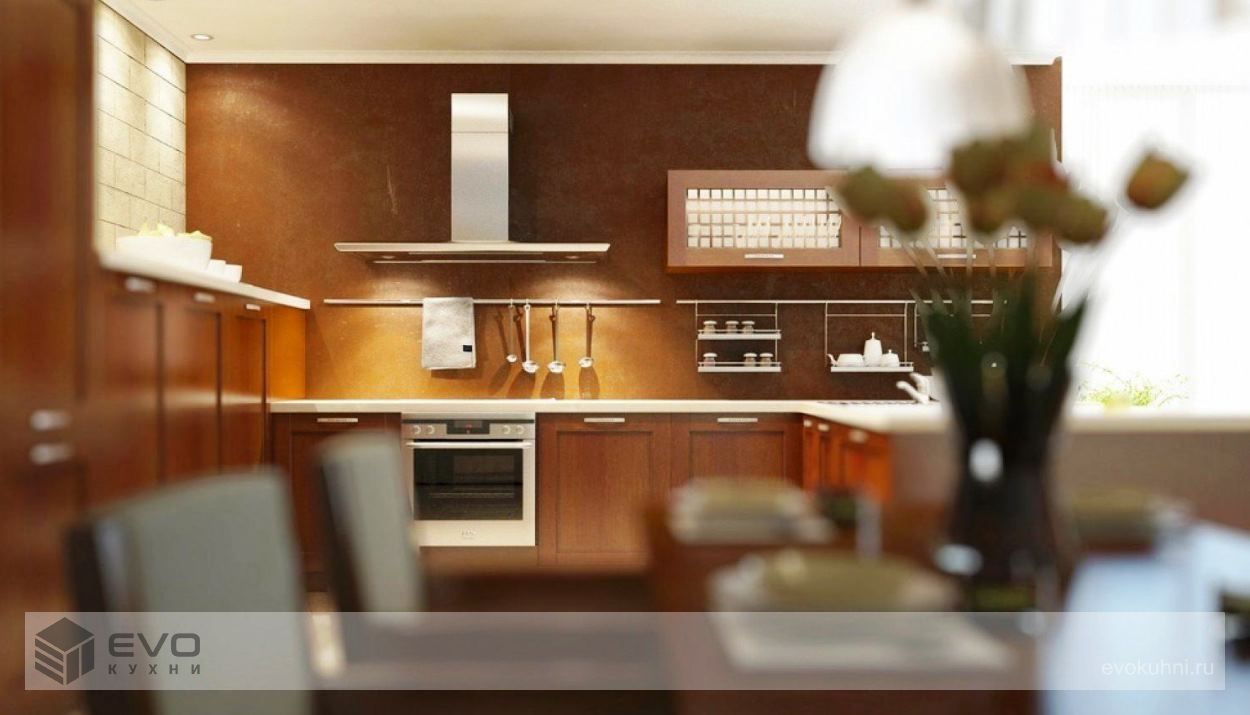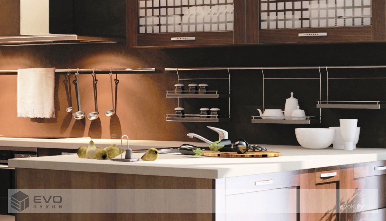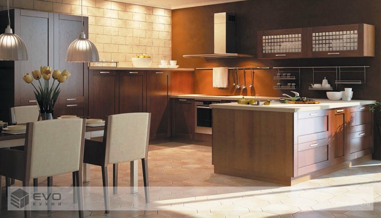 Кухня Нация – один из самых популярных вариантов оформления кухонного пространства от EVO. Это пожалуй, единственная модель из массива, которая классифицируется как кухни модерн. Фасады, имеющие ярко выраженную рамочную архитектуру, выполнены из массива ольхи, внутренняя вставка у глухих фасадов из шпонированной фанеры, у витрин выполнена из матированного стекла. Гарнитур великолепно смотрится как при классическом расположении шкафов, когда фасады как бы стремятся ввысь, увеличивая визуально высоту потолков, так и при современной компоновке, когда фасады имеют горизонтальное направление, тем самым максимально расширяя пространство всего помещения.