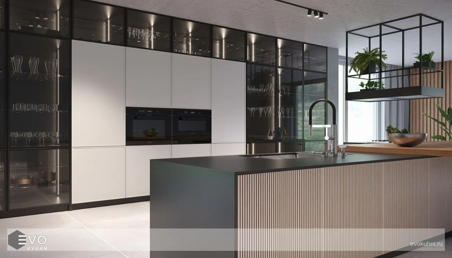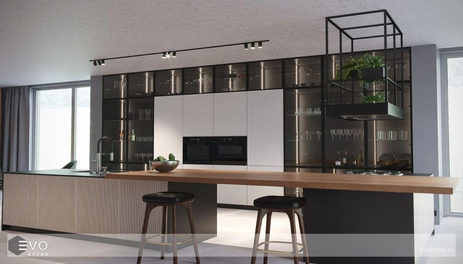 П-образная кухня модерн с фасадами Bar Шпон дуба - воплощение модной темы реек в мебельной фасаде. Рисунок шпона и ярко выраженные фладры великолепно смотрятся на лицевой поверхности кухонной мебели, где отдельные детали образуют единое целое благодаря подбору рисунка шпона.