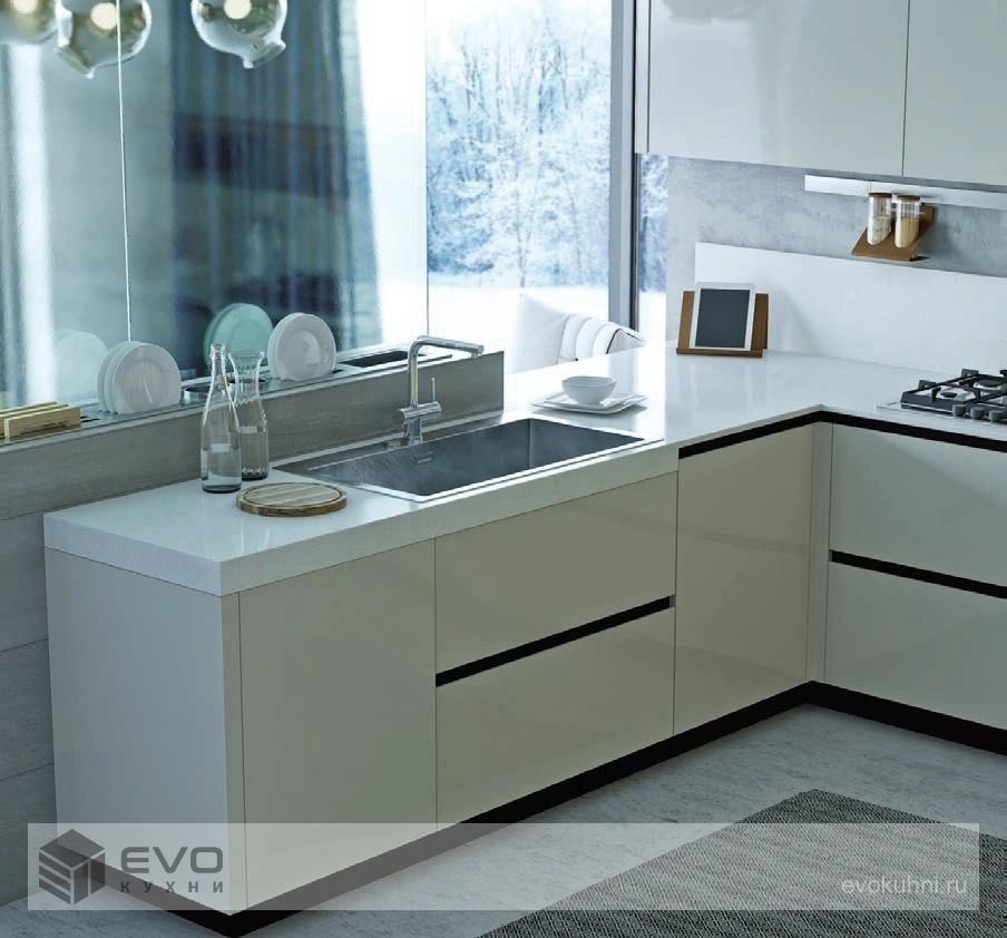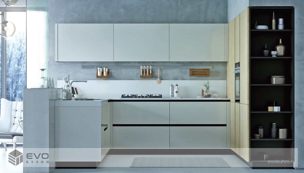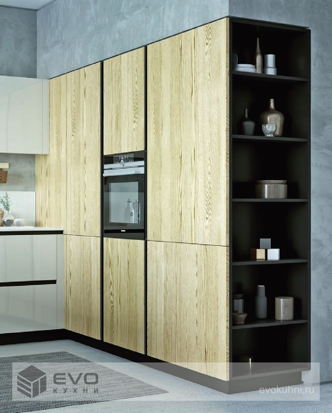 Особенностью данной модели является сочетание ненавязчивой благородности шпонированных и экспрессивности высокоглянцевых акриловых поверхностей. Высокая функциональность кухни обеспечивается наличием большого количества открытых и закрытых мест для хранения. Интегрированные в фасады ручки-профили привносят в интерьер целостность и гармоничность. Простой дизайн и нейтральные оттенки создают воздушность и уют.