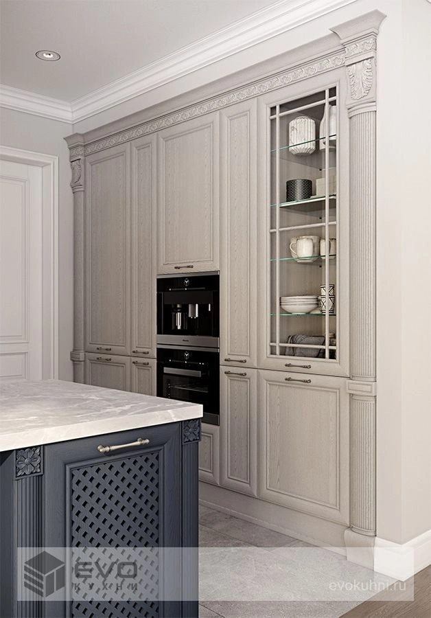 ДЕКОРАТИВНЫЕ ЭЛЕМЕНТЫ Пилястра #5; опора нижняя декоративная ОНД-1 (150 / 75), ОНД-1 (150 / 150); багет Б-3K Комби прямой (вставка гладкая); накладка декоративная НМ-2 (ширина 296 мм); плинтус мебельный ПМ-3 прямой; лепнина-3; панель декоративная БПД-6-1; вагонка, цвет NCS S 2000-N; угловая развязочная планка НМУ
