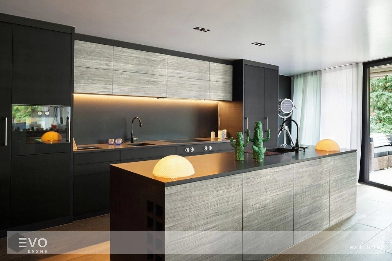 Прямая кухня хай-тек с островом с рельефными фасадами Split Pearl –– имитация трещины на старой доске, пролежавшей под дождем и высушенной солнцем.
